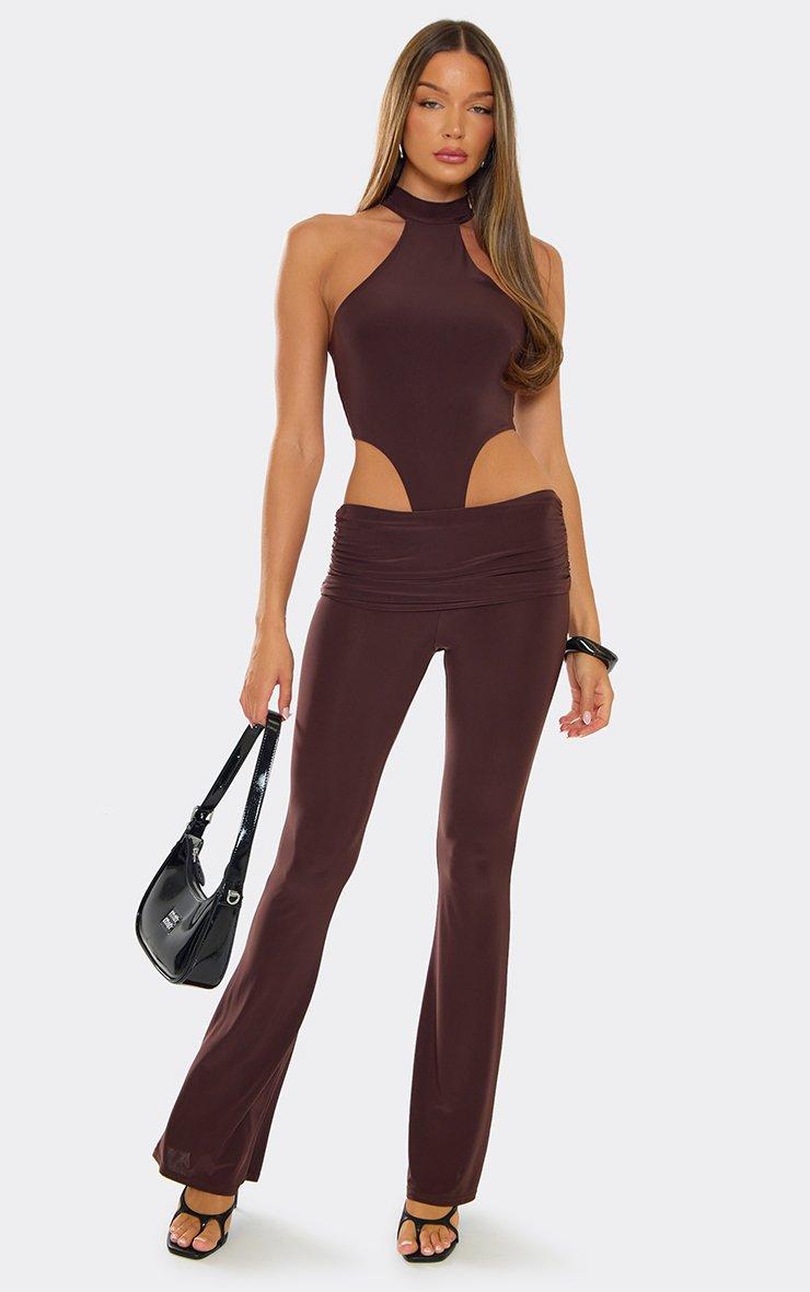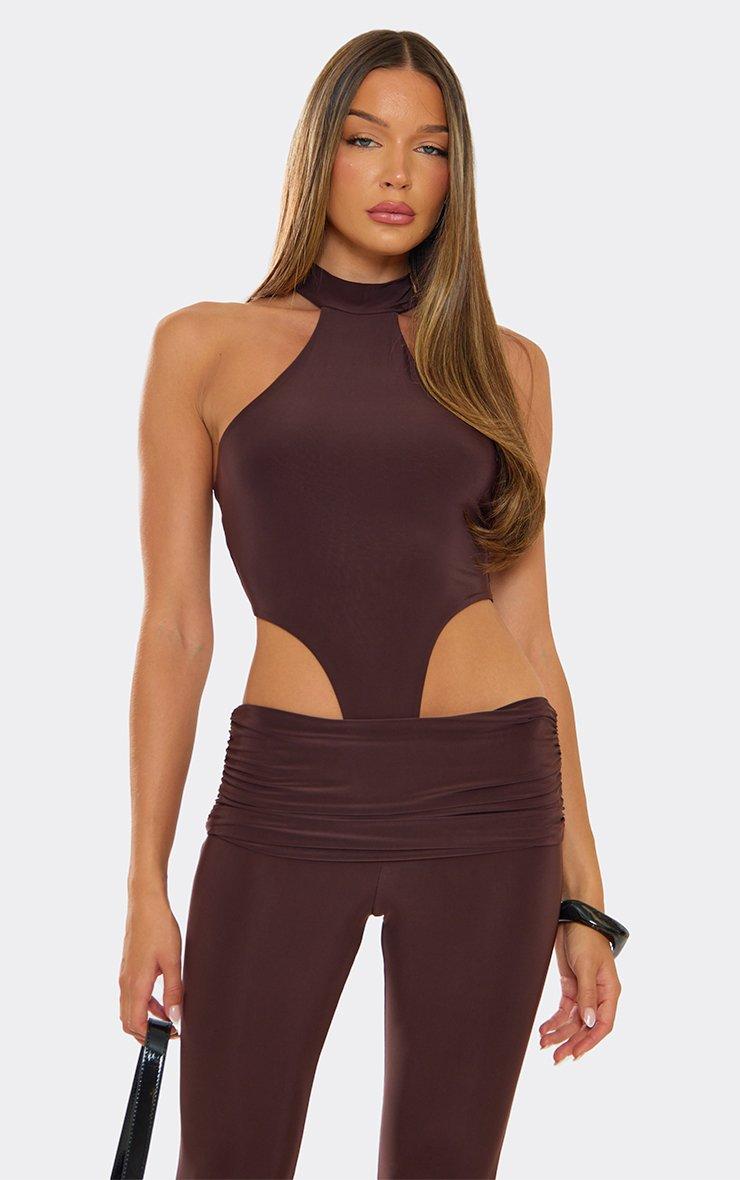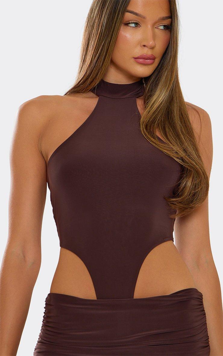 Night-out vibes, doll. Featuring a chocolate brown material with high neck racer and high leg detailing, this bodysuit is giving bold, chic energy for statement evenings.