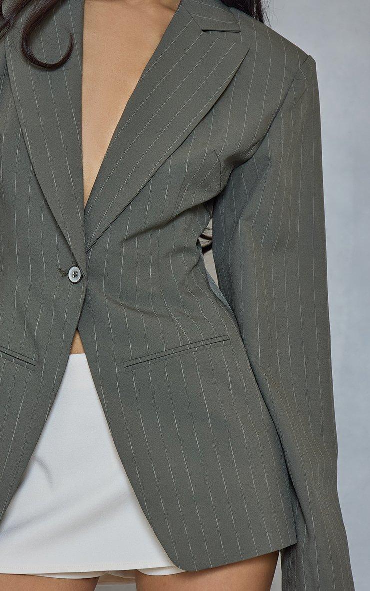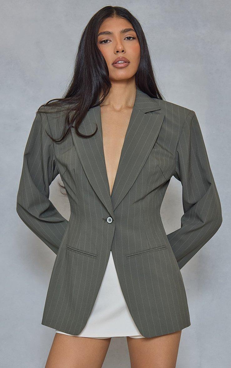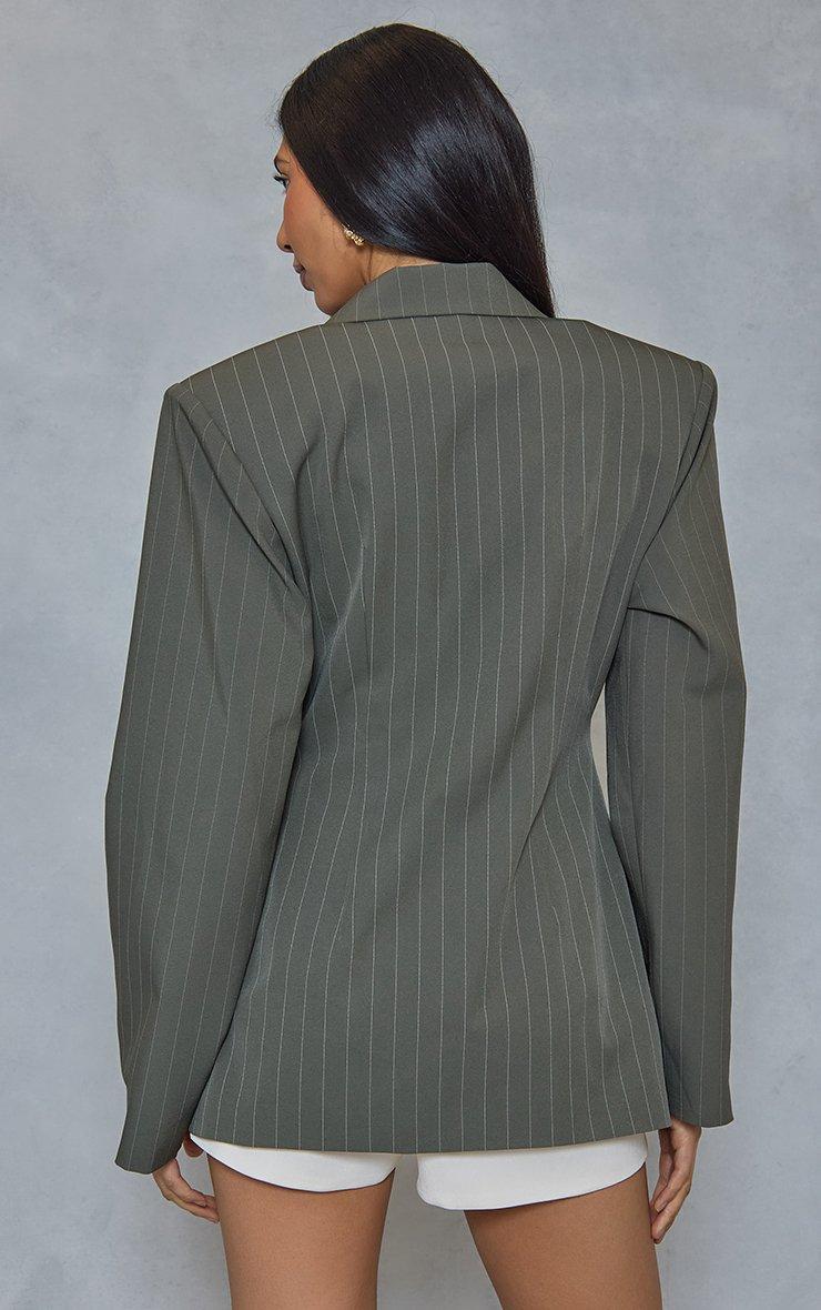 Plunge Shoulder Pad Detail Blazer In Khaki Green Pinstripe