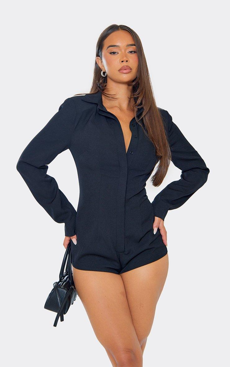 Long Sleeve Shoulder Pad Detail Button Up Front Playsuit In Black
