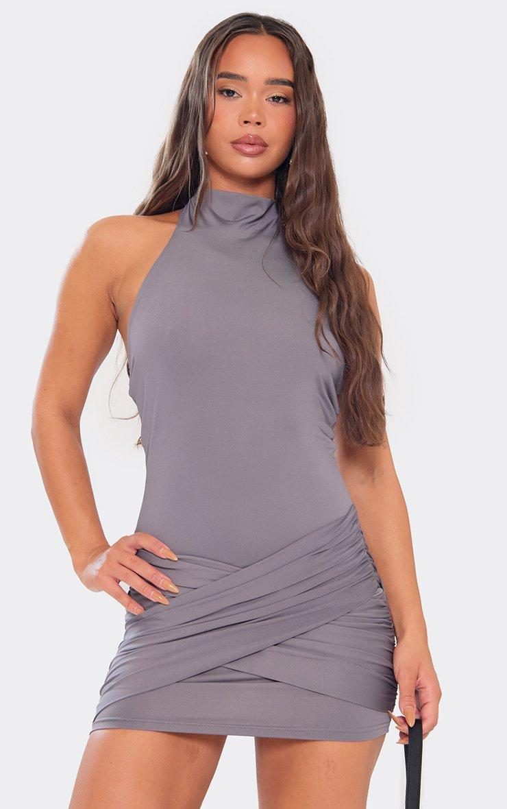 Step into chic sophistication with the grey high neck mini dress. Made in a flattering bodycon fit, this mini dress features a halter-neck design that beautifully frames the shoulders. The wrap front and hem detailing add a stylish twist, highlighting your curves and creating subtle movement. With its mini length, this dress is the perfect dress for a concert, nights out, or any occasion that calls for a sleek vibe. Style our grey high neck mini dress with some mini boots and gold hoops . We (shamelessly) wear them 24/7. Key Features Charcoal Grey Colour Halter-Neck Wrap Front & Hem Detailing Bodycon Fit Sleeveless Mini Length