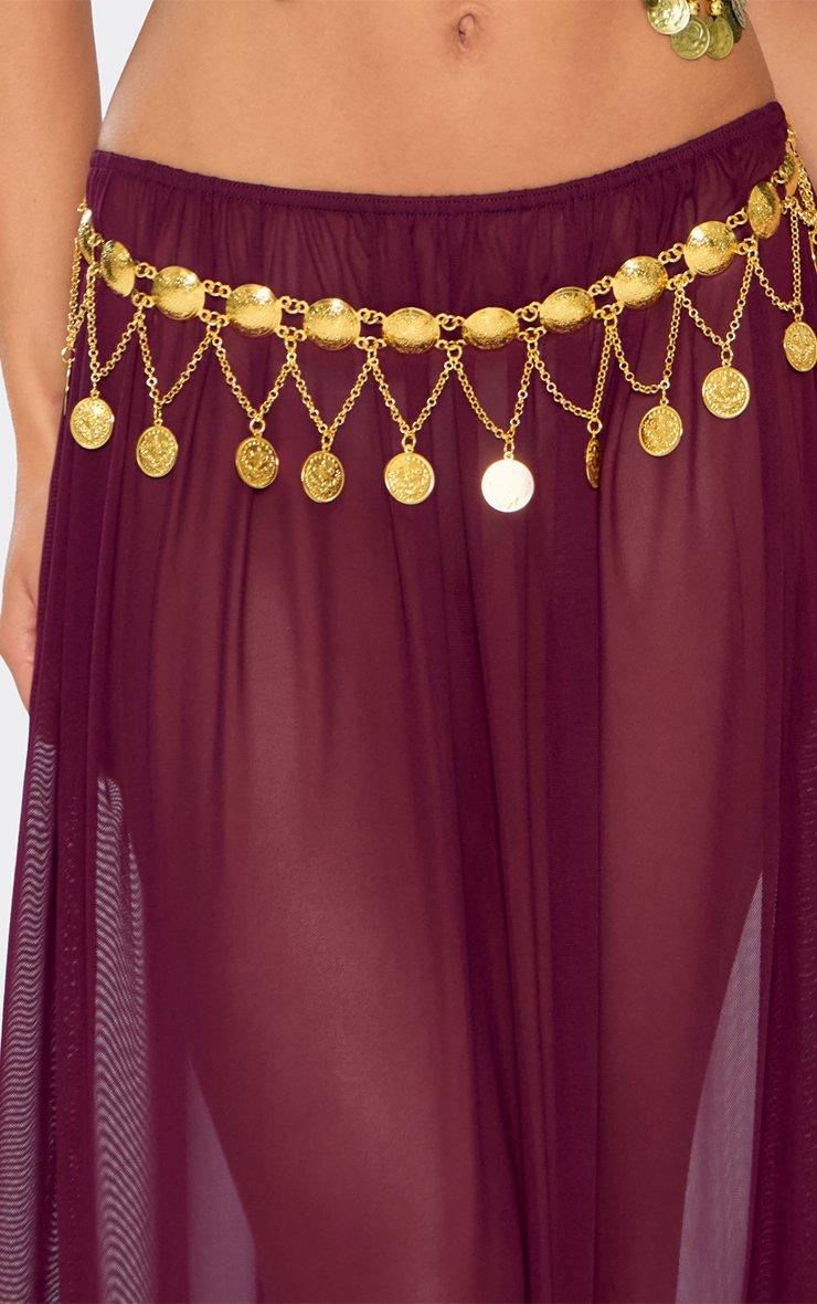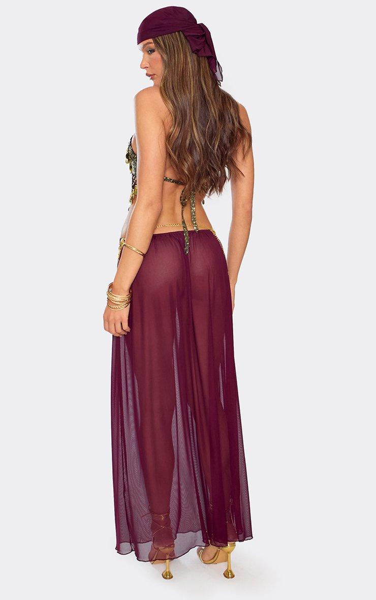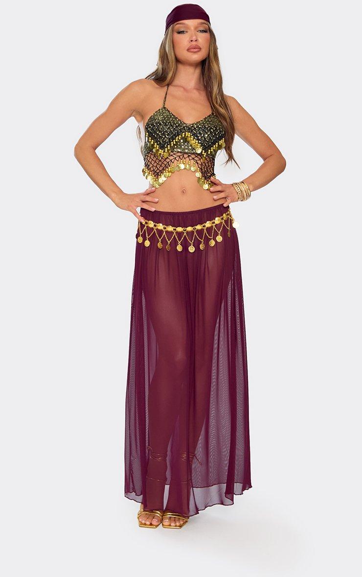 The crystal ball has spoken, and you're so wearing this fortune teller costume. Bringing all the mystical energy you're after, this set features a sultry, flowy ruched maxi skirt , plus a matching bandana. Made with soft, sheer chiffon, this airy and comfy set teases the right amount of skin. Stun as a sexy fortune teller by styling this purple fortune teller costume set with gold disc detail chain belt , gold disc detail headpiece , and gold earrings . We see the future, and it looks like your Halloween outfit ideas just got a major upgrade. Key Features Purple Chiffon Bandana Maxi Skirt Ruching Low-Rise Waist