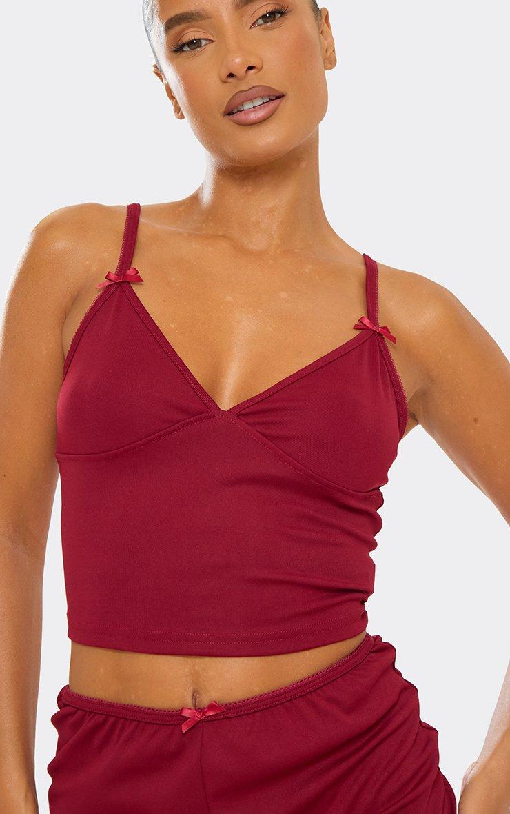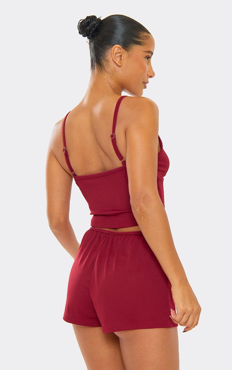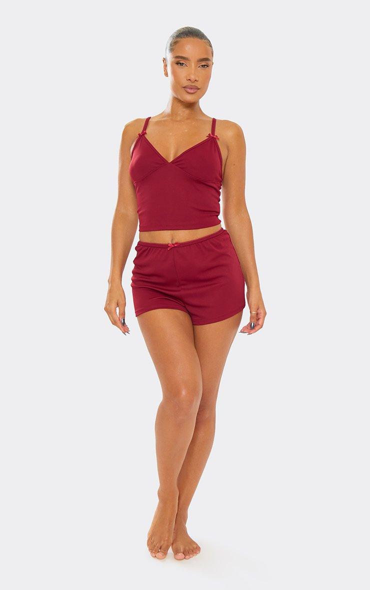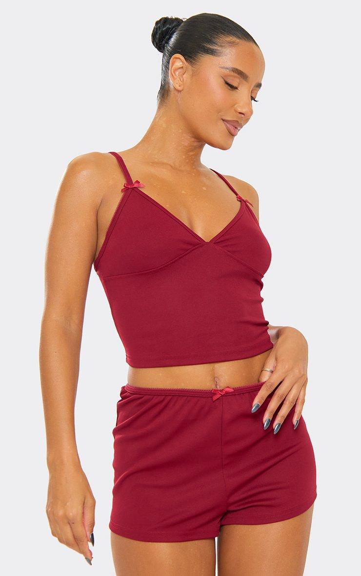 Strappy V Neck Crop Top And Short Pyjama Set In Burgundy Red