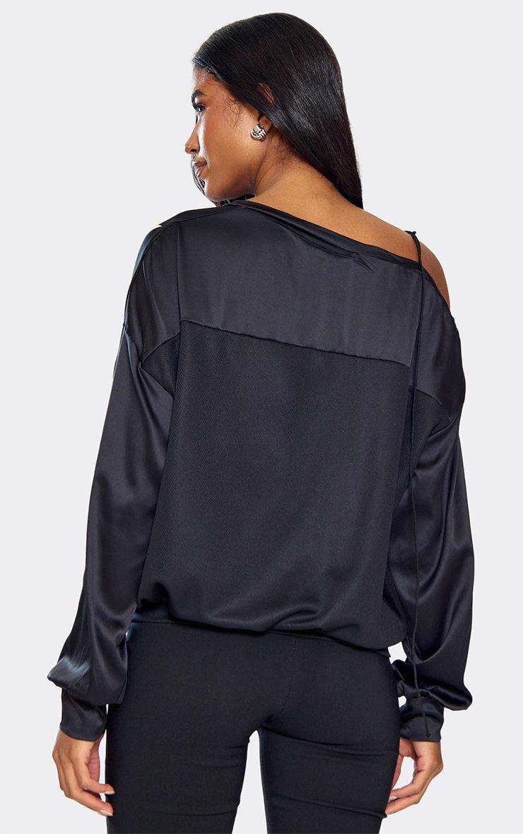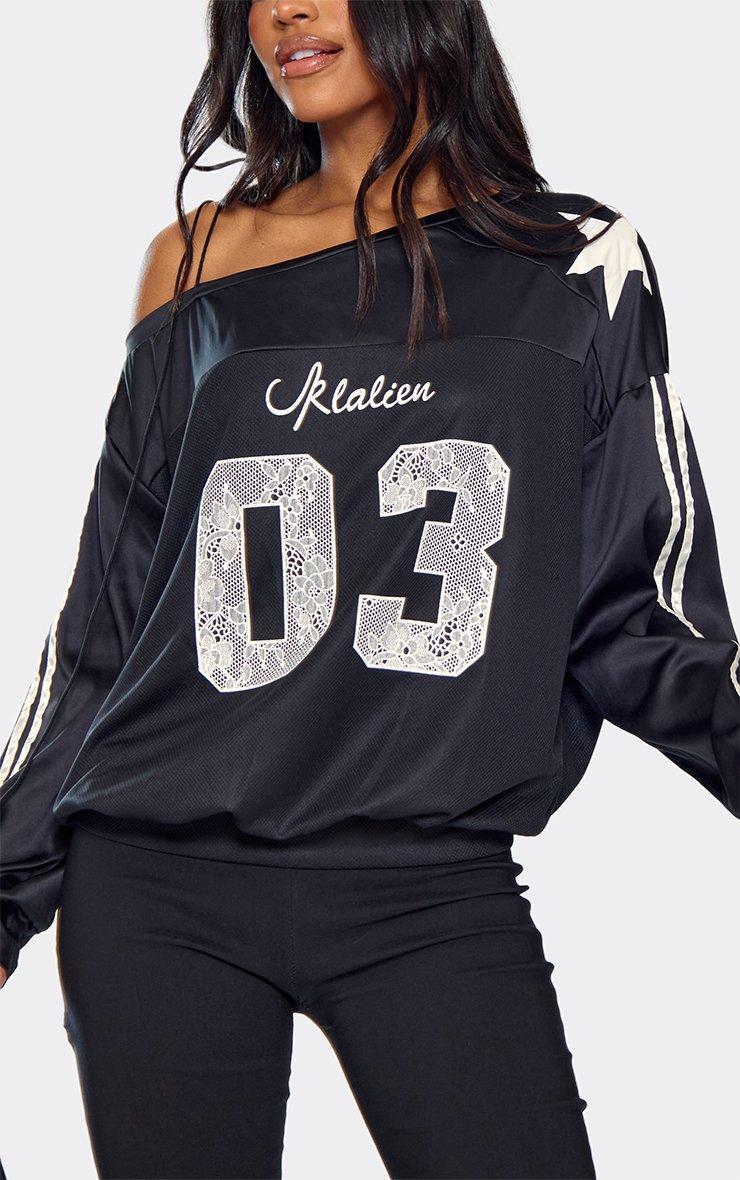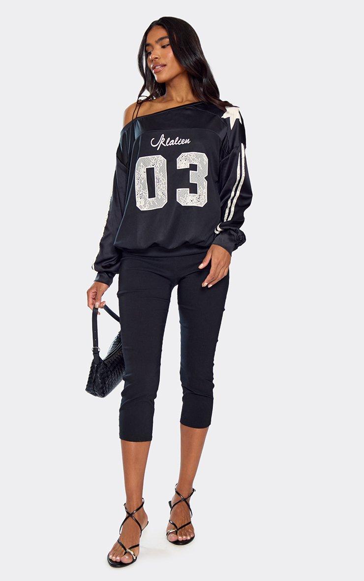 Slash Neck Tie Detail Diamante Varsity Top In Black