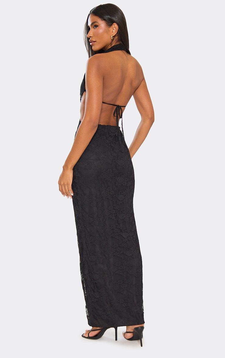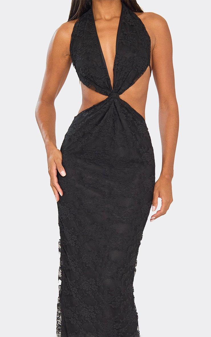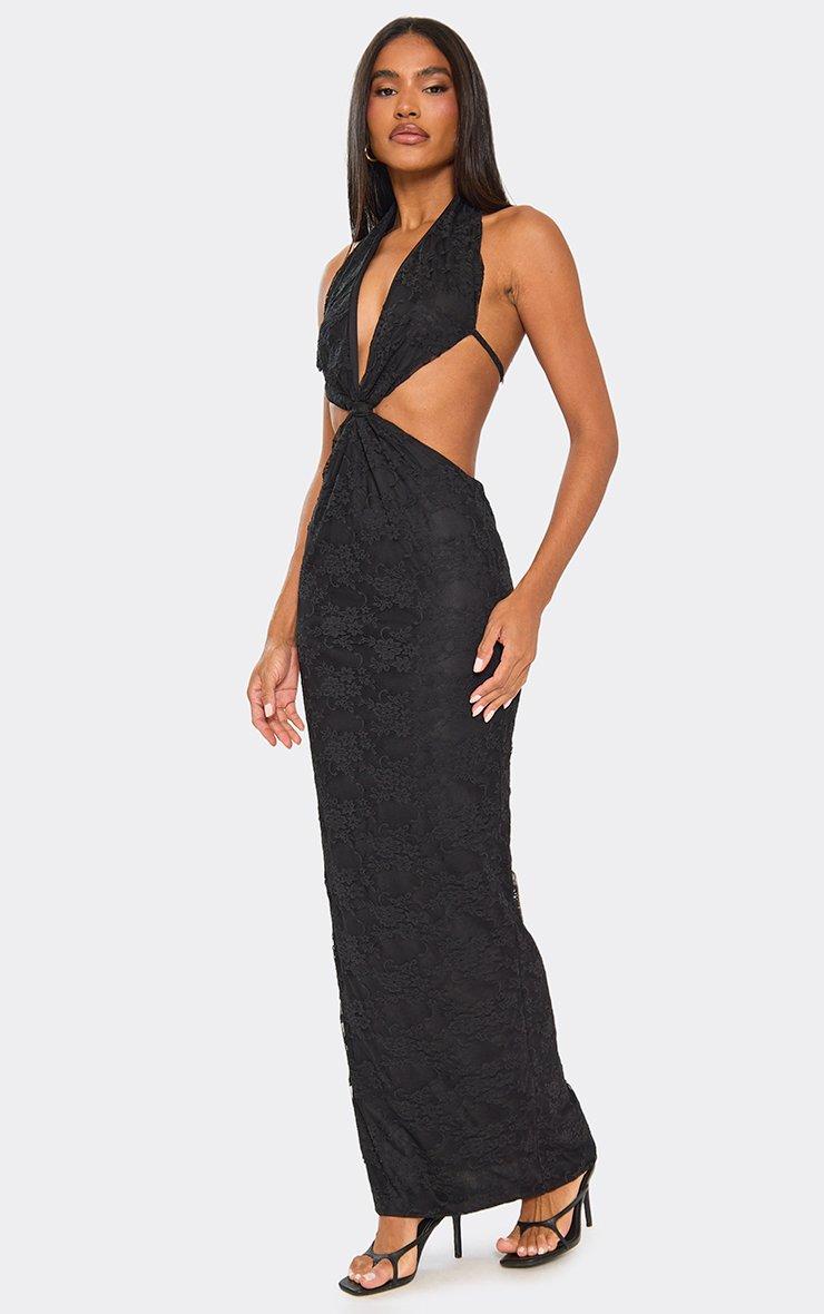 Plunge Halterneck Knot Front Detail Maxi Dress In Black Lace