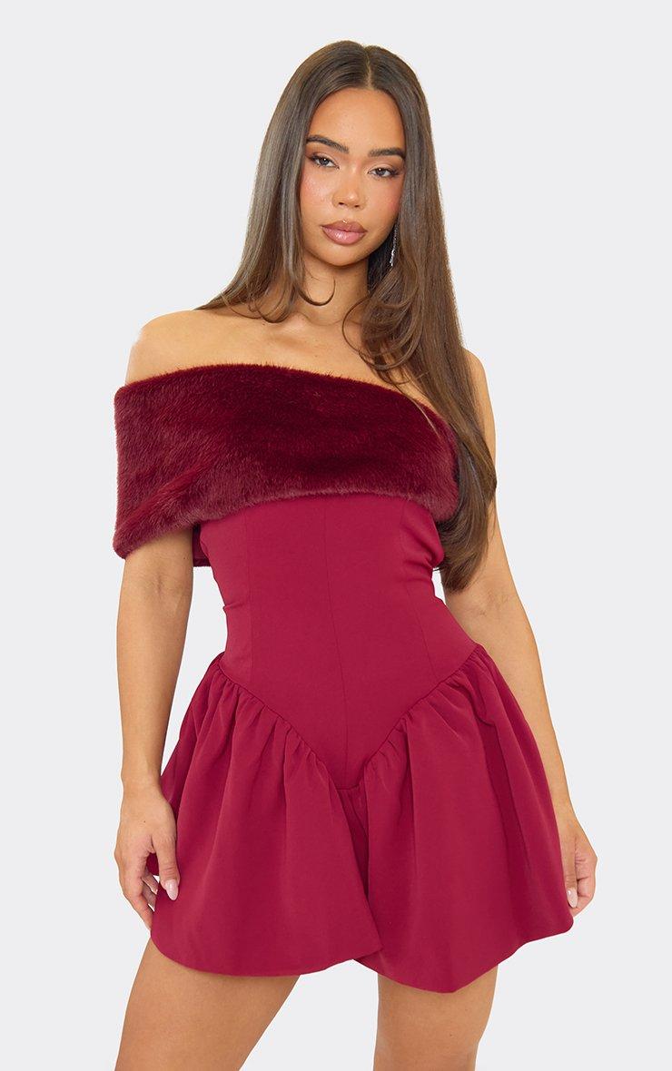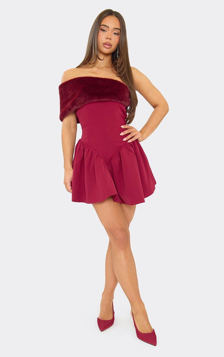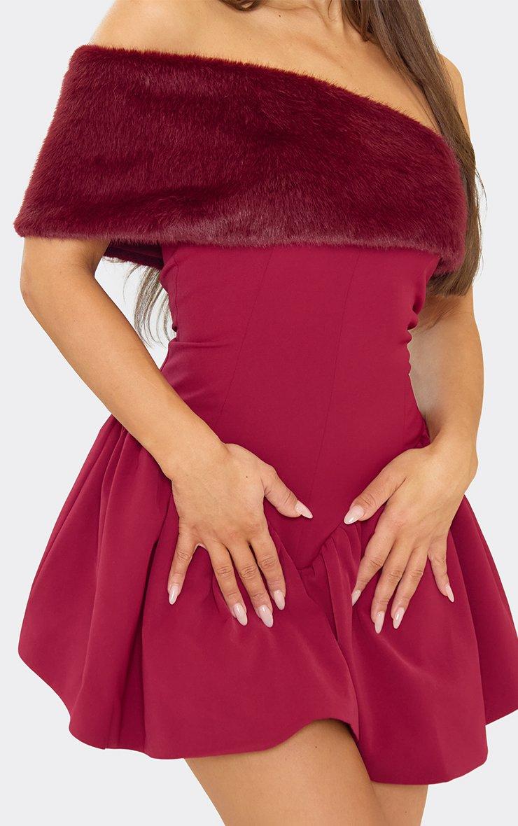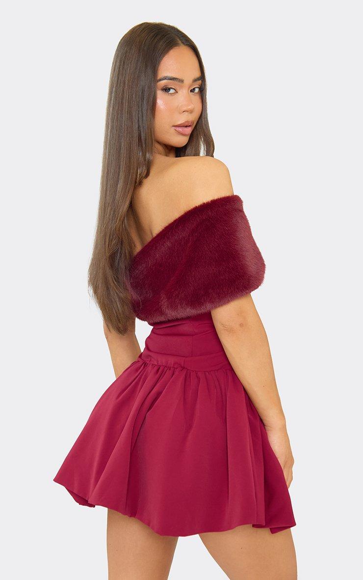 Over Shoulder Faux Fur Pleated Mini Dress In Burgundy