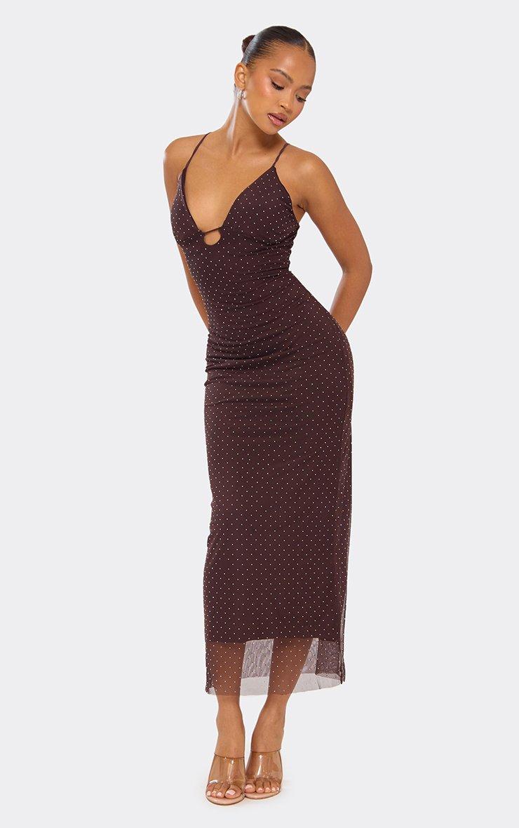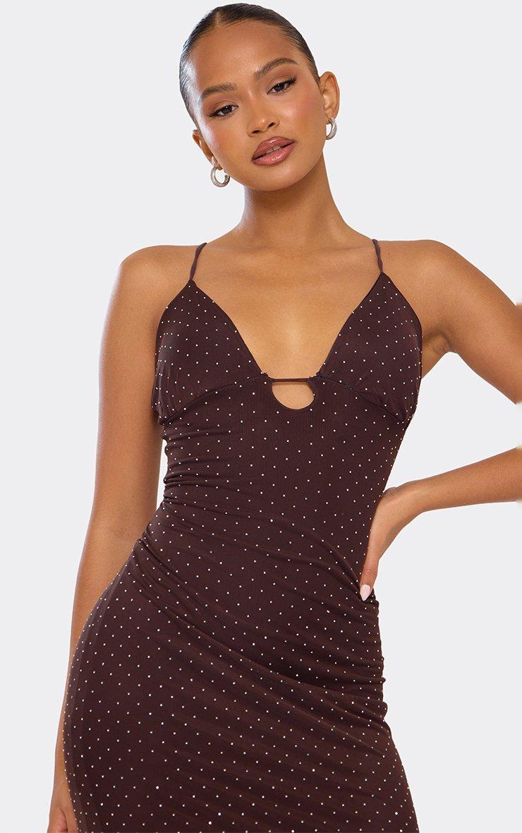 Strappy Plunge Detail Fitted Midi Dress In Chocolate Brown Diamante