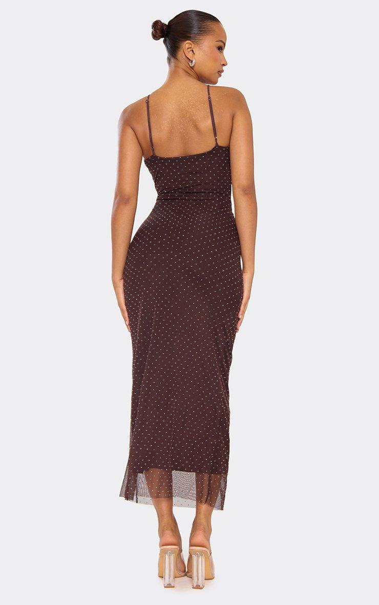 Own the dance floor in our chocolate brown glitter maxi dress, this dress was made to be seen. With a daring plunge neckline, sleek spaghetti straps and fullâon fitted silhouette, this maxi dress is your wardrobe's VIP pass for nights out where the lights don't go down. The shimmering diamante embellishment adds that showâstopper detail, turning the floor into your runway. Style it with strappy heels , statement earrings and all the confidence. This look was made to finish the night in style and become the newest member of your night out dresses collection. Key Features Chocolate Brown Colour Plunge Neckline Bodycon Fit Diamante Embellishment Maxi Length