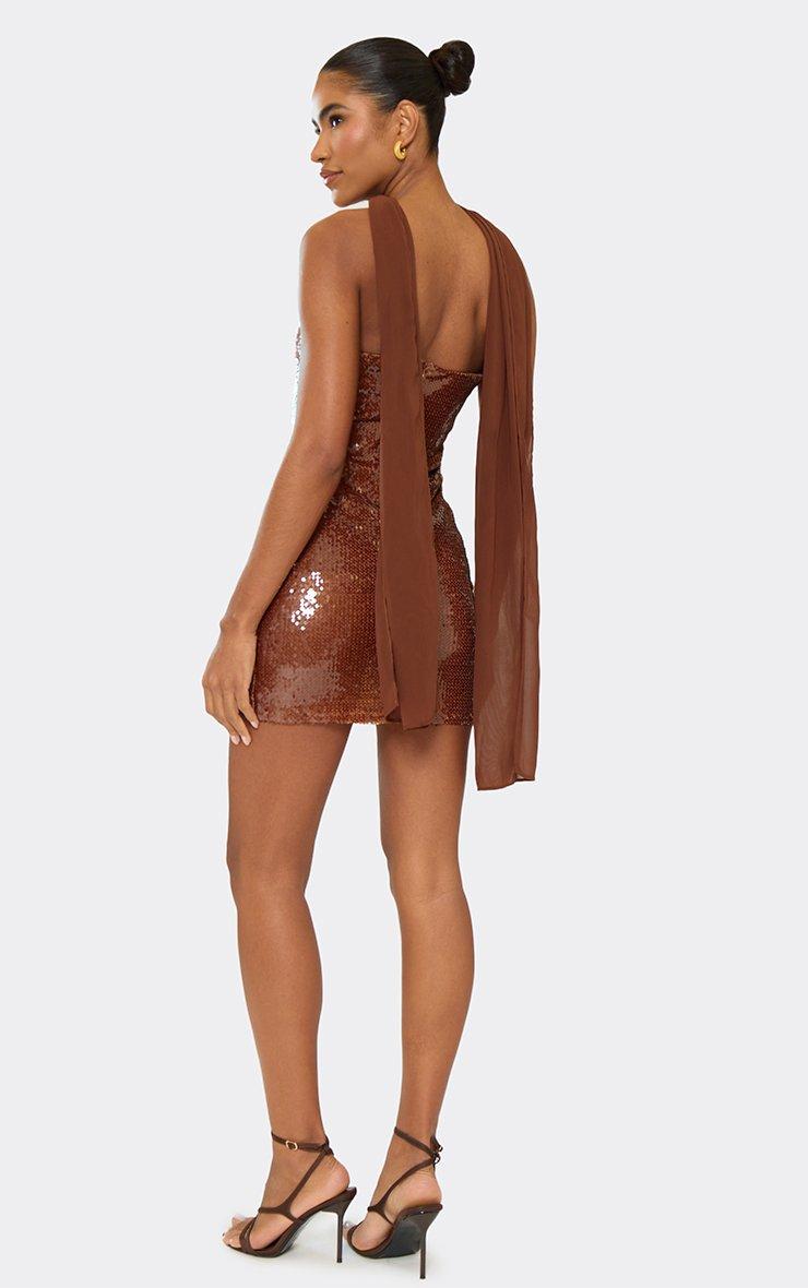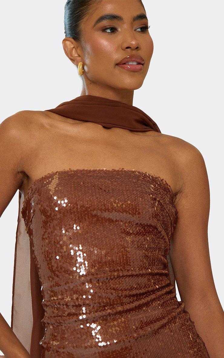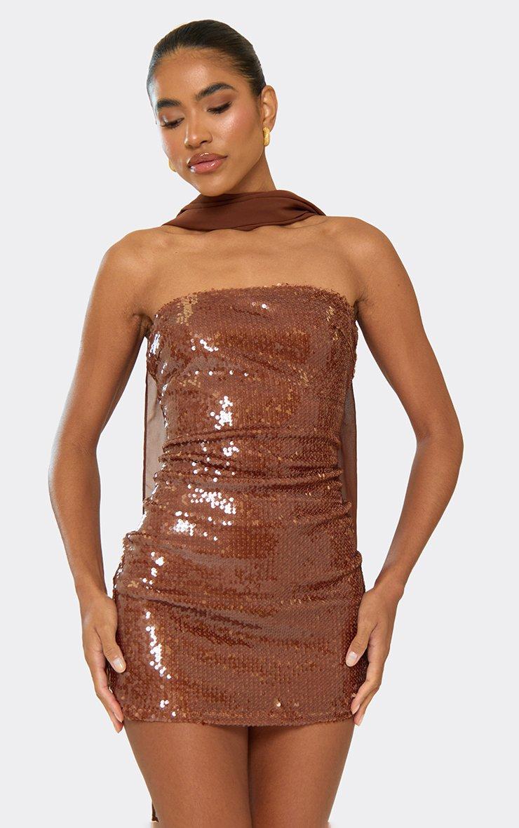 Bring full glam energy to your next event with this mini brown sequin dress, designed to shimmer with every step. The mini brown sequin dress features a bandeau neckline and chic scarf detail for a luxe, high-impact finish - ideal when you're hunting for the perfect birthday party dress or scrolling for standout special occasion dresses. Style it with metallic heels and a sleek clutch for the ultimate birthday party dress vibe, or add strappy stilettos and statement earrings when you're creating elevated looks. Sparkly, sculpting and made to be the moment - this mini dress is guaranteed to steal the spotlight. Key Features Brown Colour Sequin Fabric Bandeau Neckline Scarf Detailing Mini Length