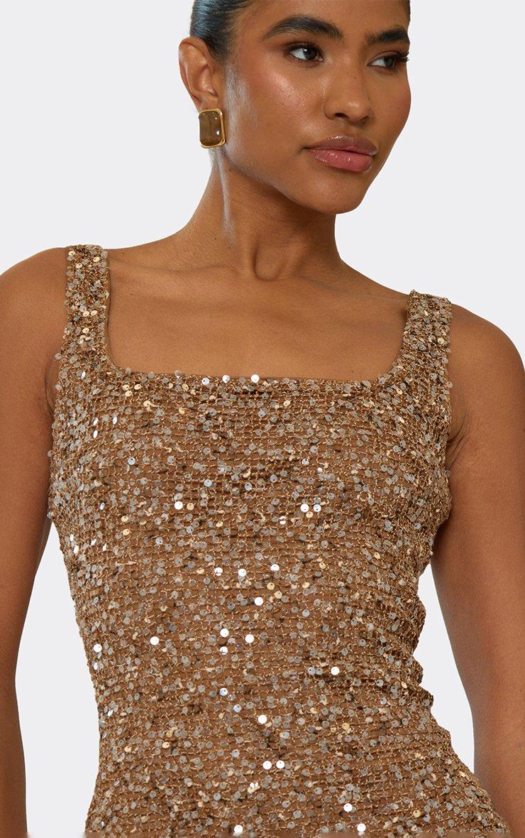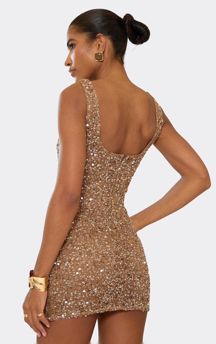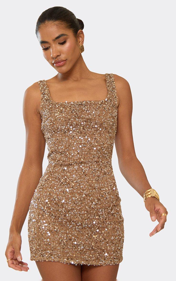 Square Neck Embellished Detail Mini Dress In Light Brown Textured Sequin