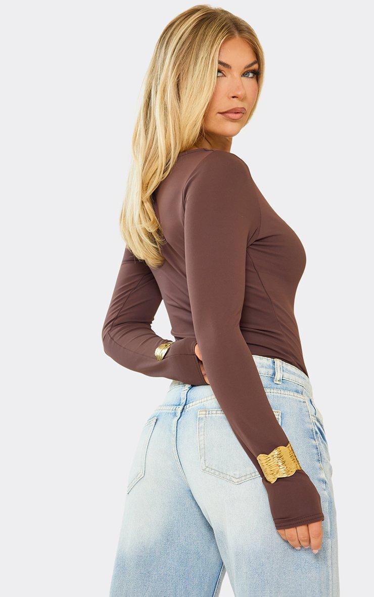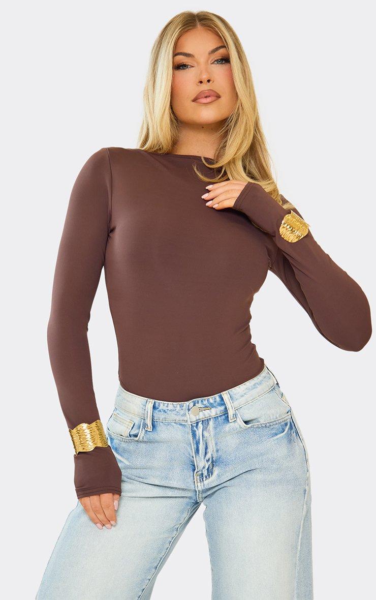 Turn up the chic, doll! Featuring chocolate brown fabric, this long sleeve bodysuit stuns with slash neck detailing for a bold, sleek finish packed with attitude.