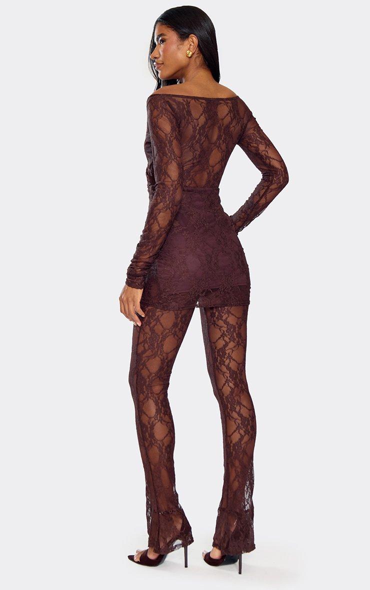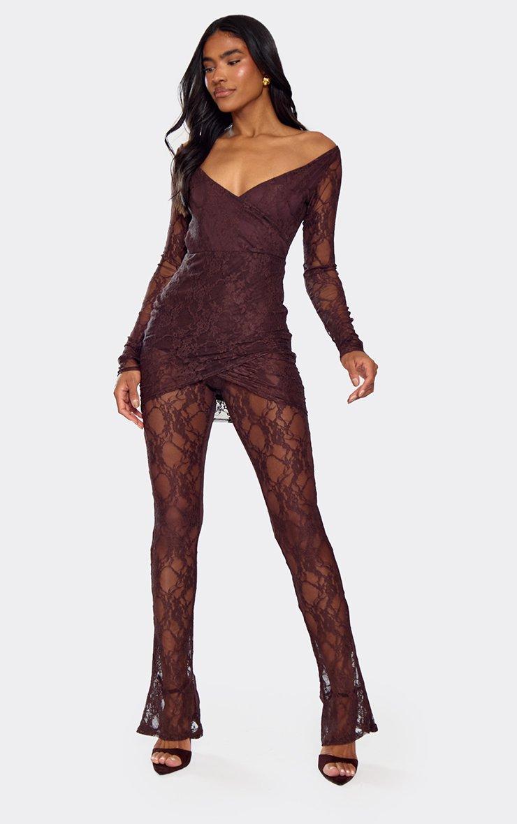 Clock any evening wear dress code with this brown lace jumpsuit. Effortlessly elegant, it features an off-the-shoulder neckline and a plunging wrap front that adds sophistication to any night-out look. Made from delicate lace with a tailored fit, this jumpsuit hugs your waist and skims your shoulders for a figure-flattering silhouette. No need to wonder how to style this brown lace jumpsuit, we love it paired with some gold hoops and gold heels. It's a solid statement-maker. Key Features Chocolate Brown Colour Off-The-Shoulder Neckline Plunge Wrap Front Long Sleeve Design Tailored Fit