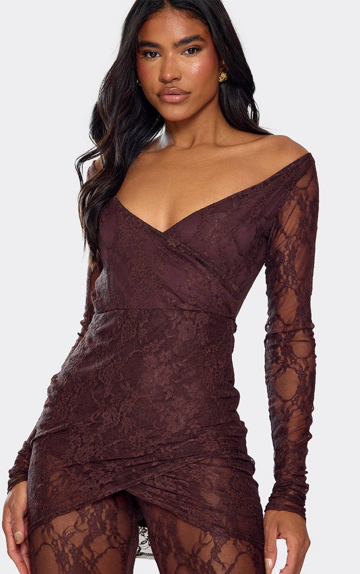 Off The Shoulder Plunge Wrap Detail Jumpsuit In Chocolate Brown Lace