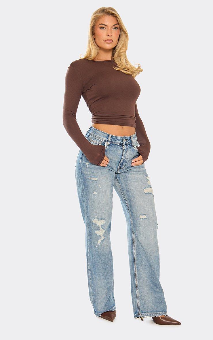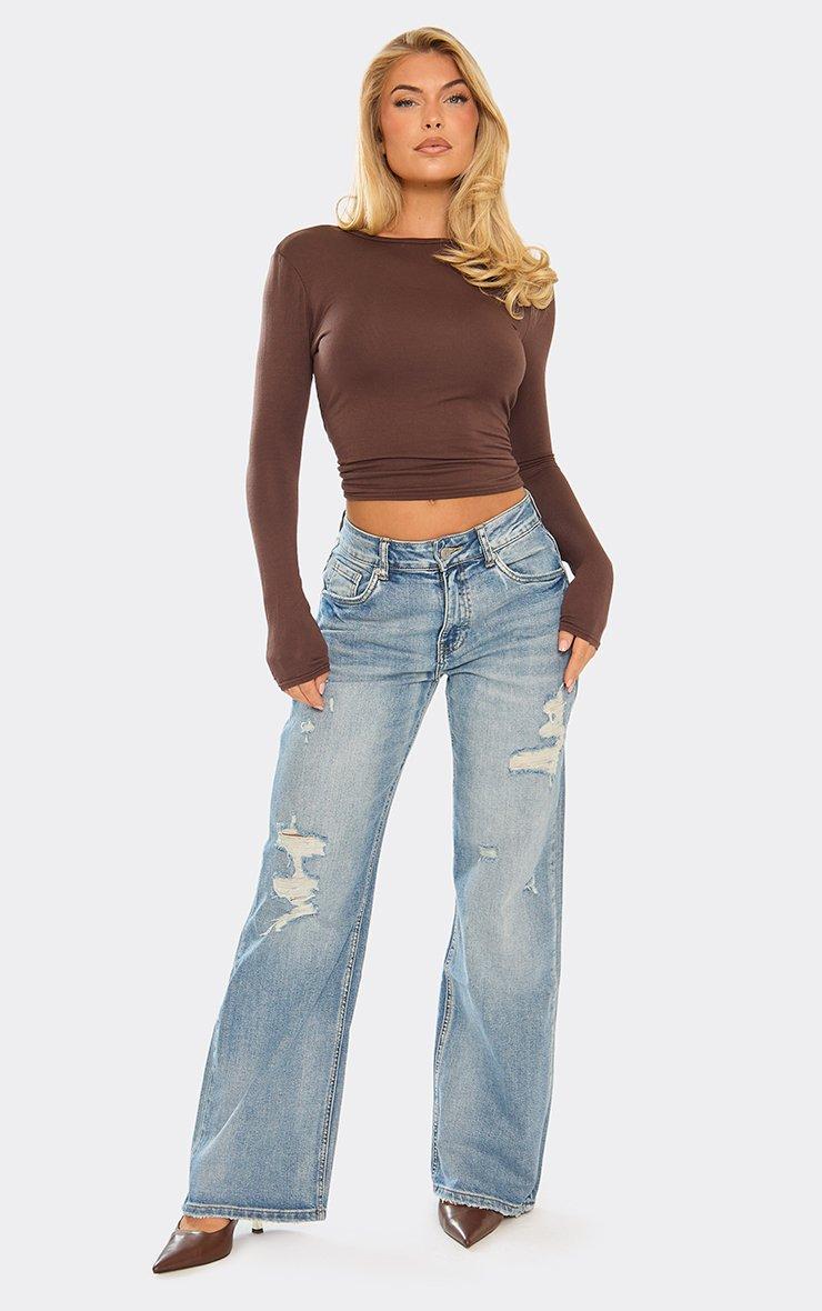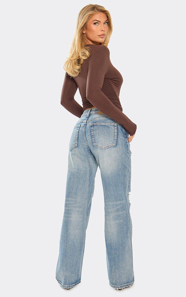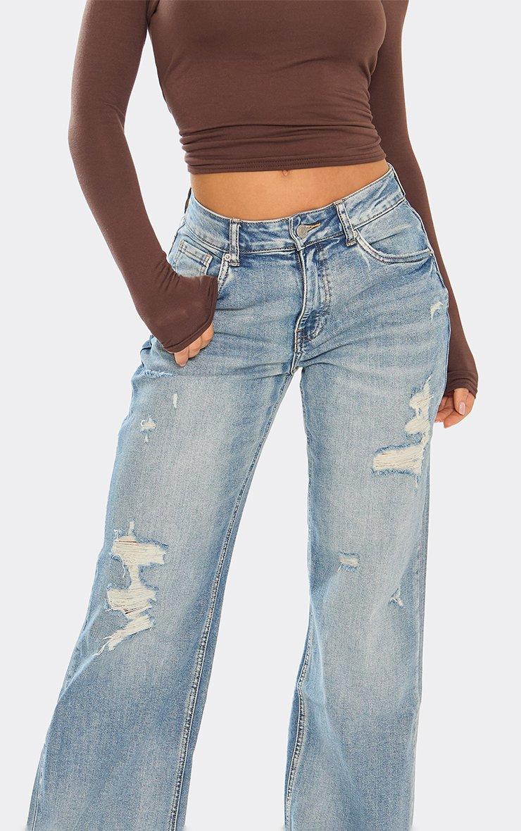 Into the cool-girl aesthetic? You need these mid-rise distressed blue jeans in your collection. A closet classic, these wide-leg jeans feature a washed blue hue and distressed detailing that adds edge to anything you pair them with. Made from cotton stretch denim, these blue jeans flatter your figure with their mid-rise waist and wide-leg style. If you're struggling to assemble a mid-rise jeans outfit for a night out, we've got some inspo. These mid-rise distressed blue jeans go hand in hand with a lace top , a shoulder bag , and thong-strap heeled mules . They're those jeans that turn heads without doing too much. Key Features Blue Wash Cotton-Stretch Denim Distressed Detailing Mid-Rise Waist Wide-Leg Style