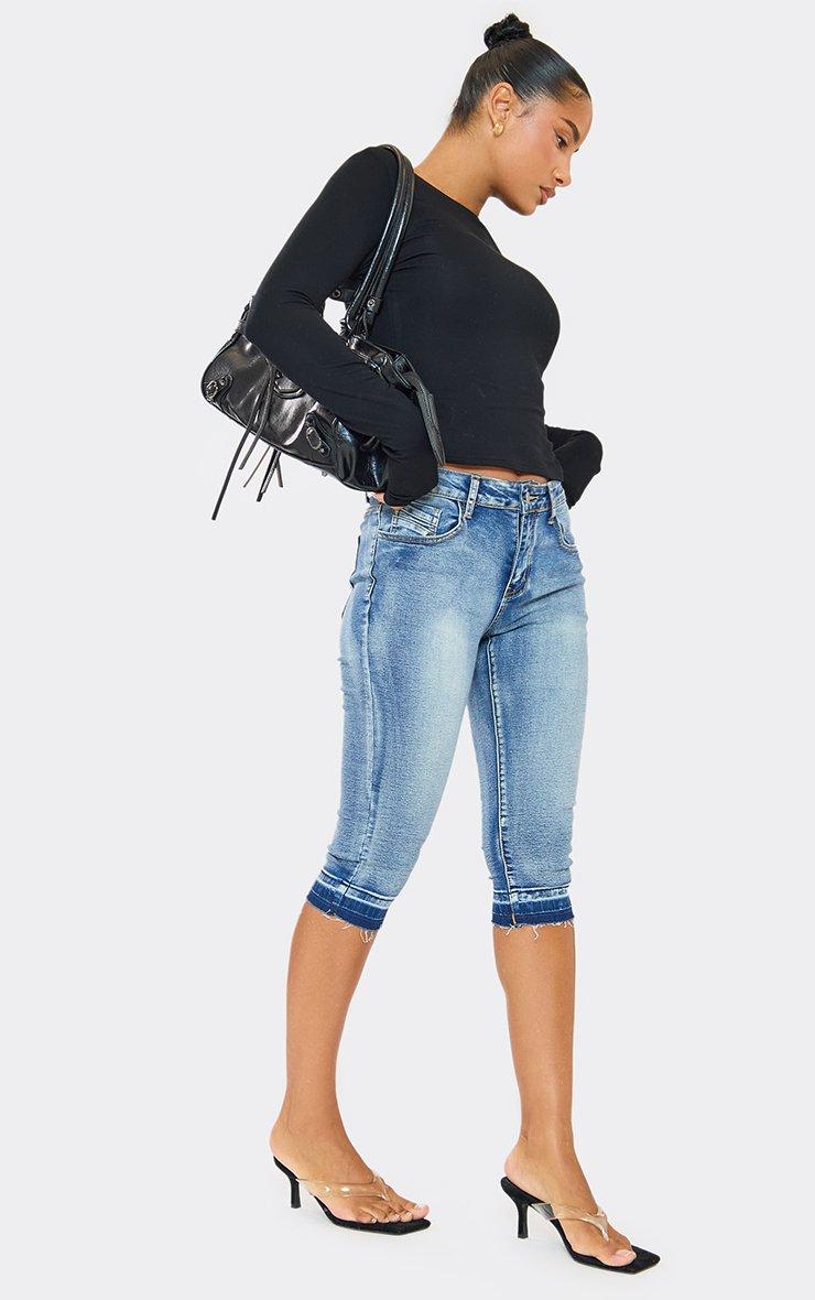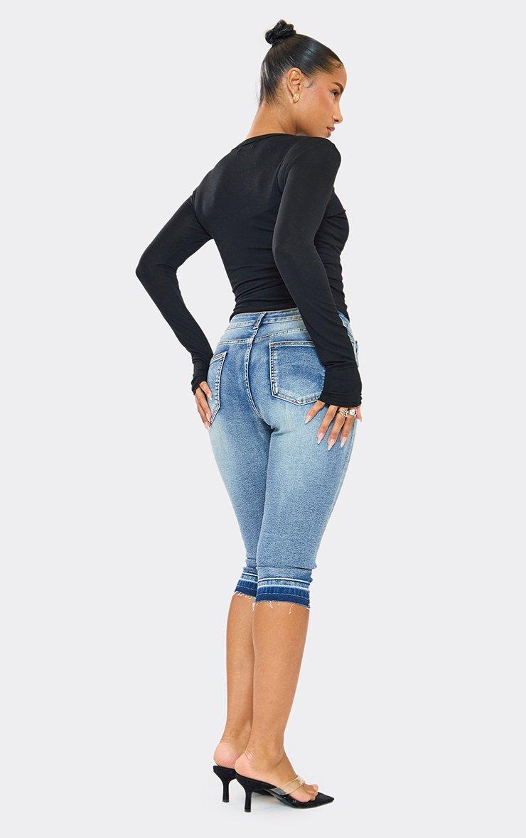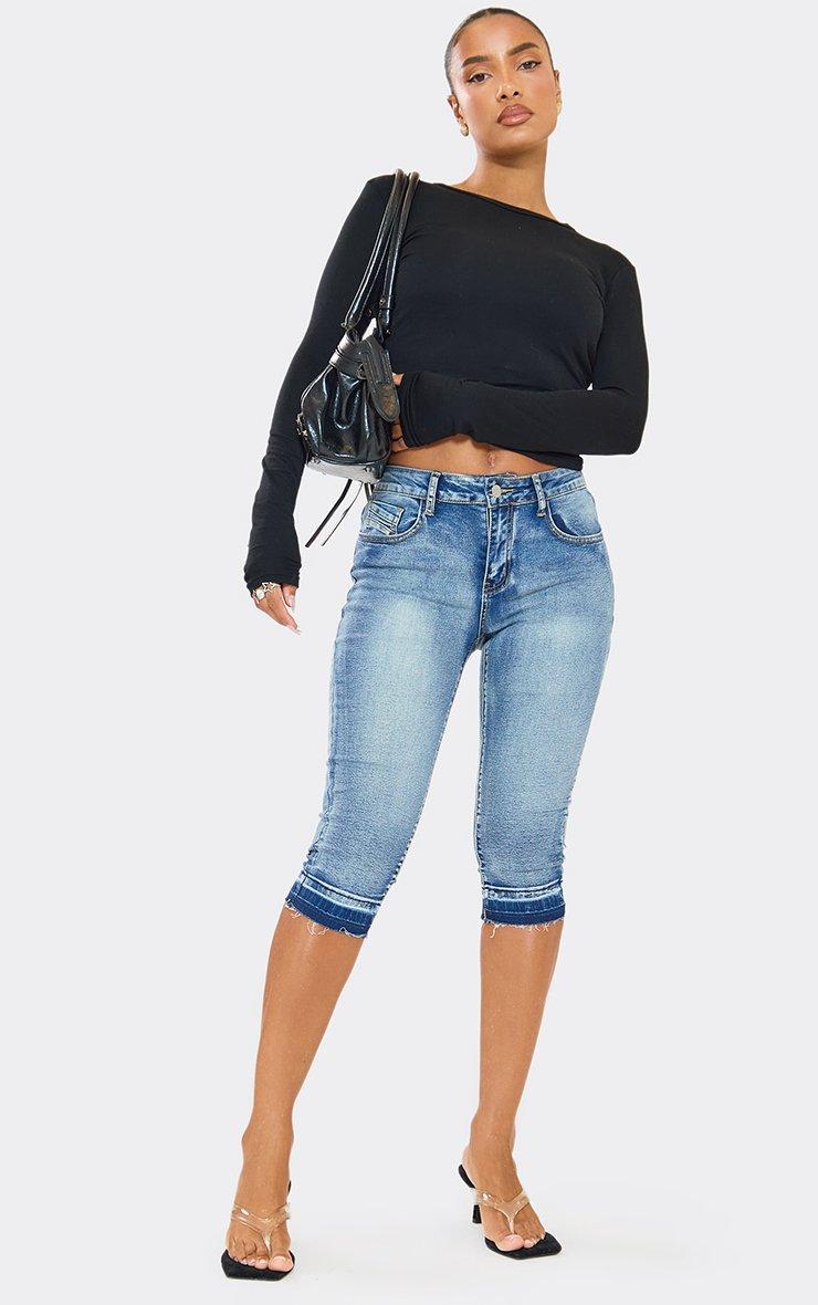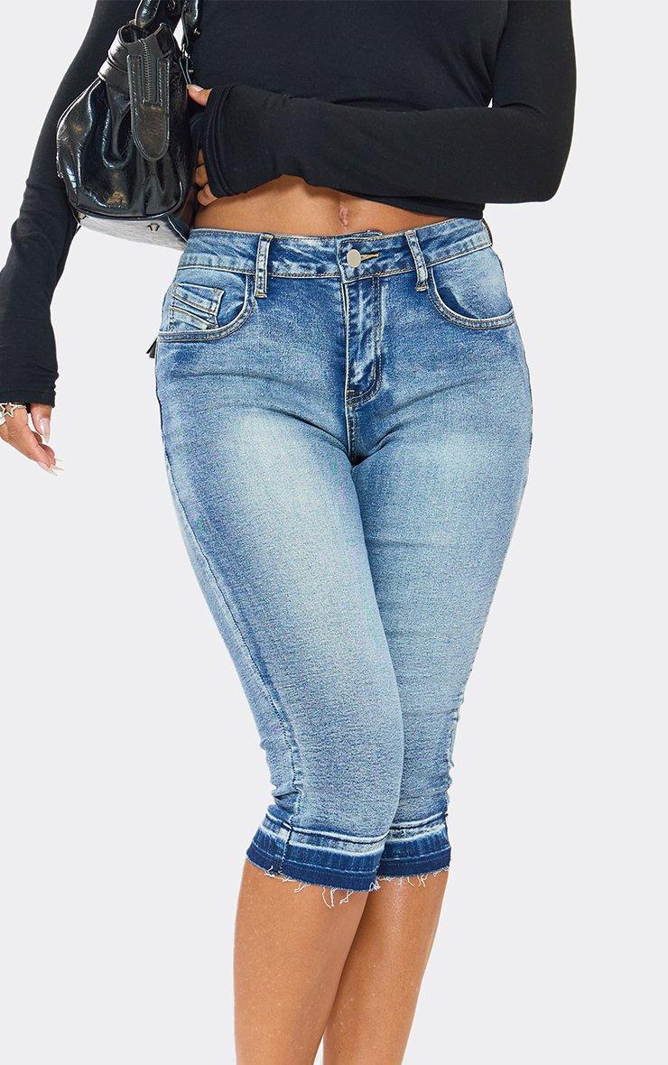 Dipped Hem Capri Jeans In Washed Blue Denim