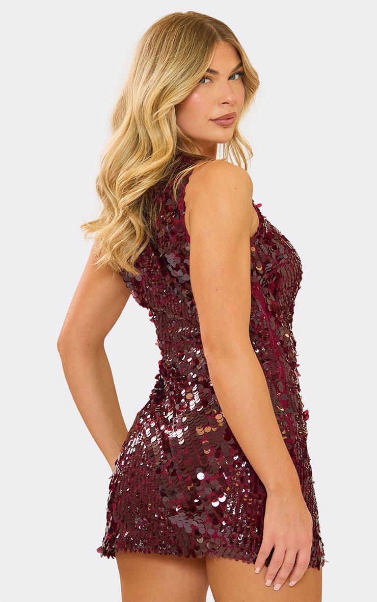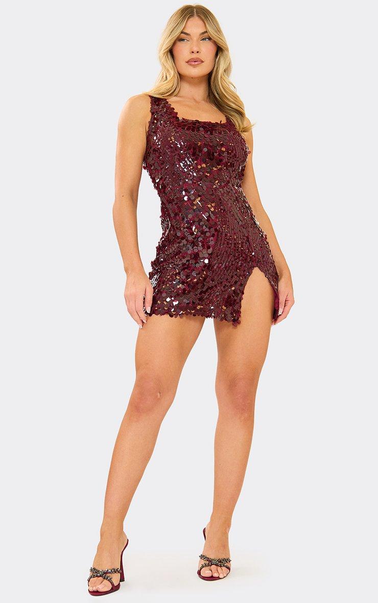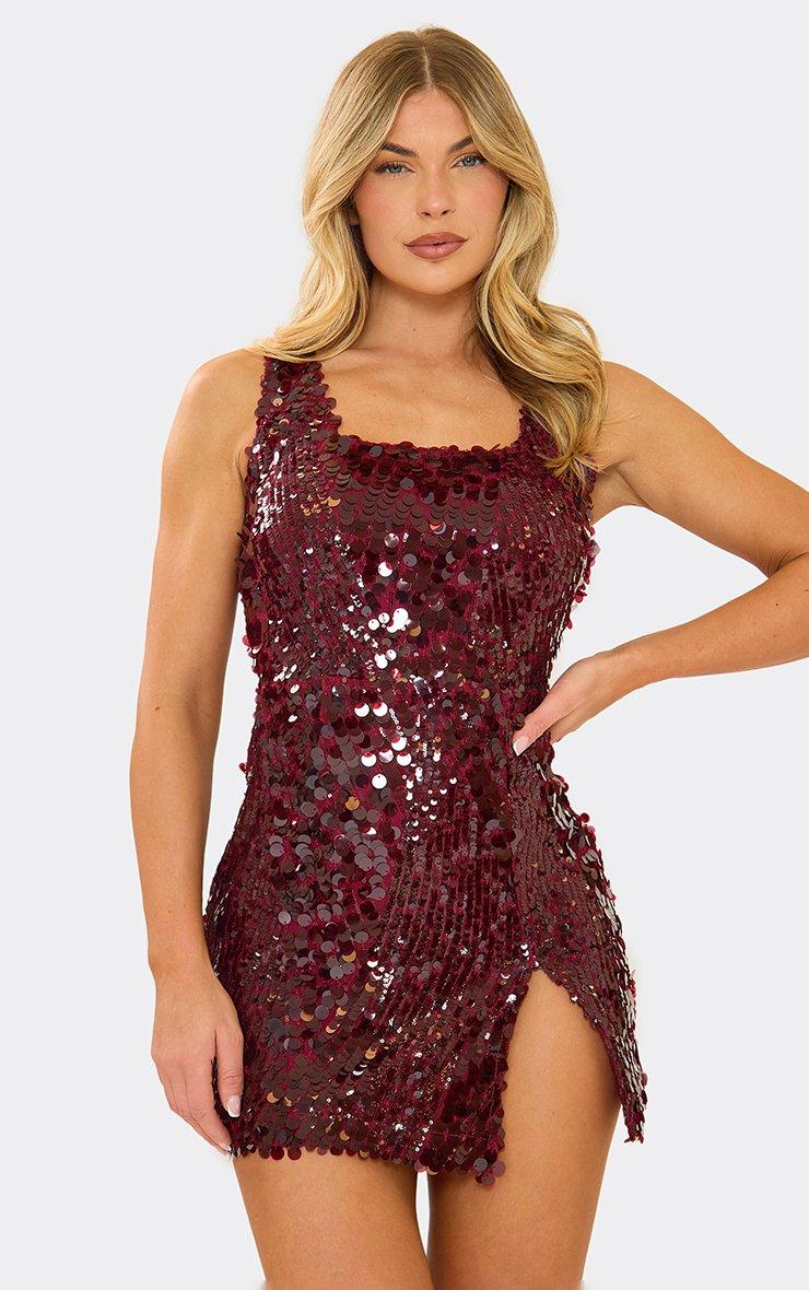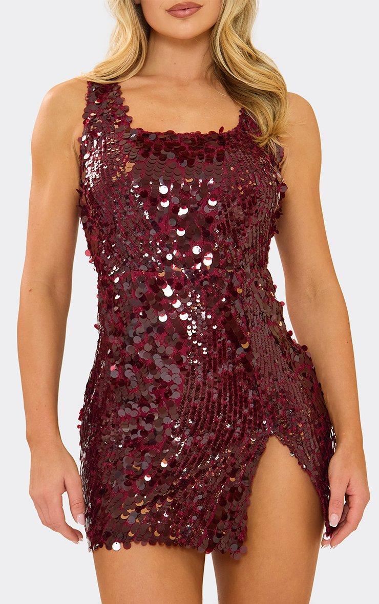 Square Neck Split Hem Detail Mini Dress In Burgundy Disc Sequin