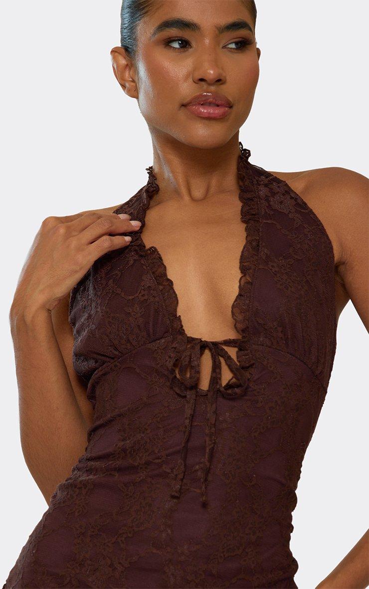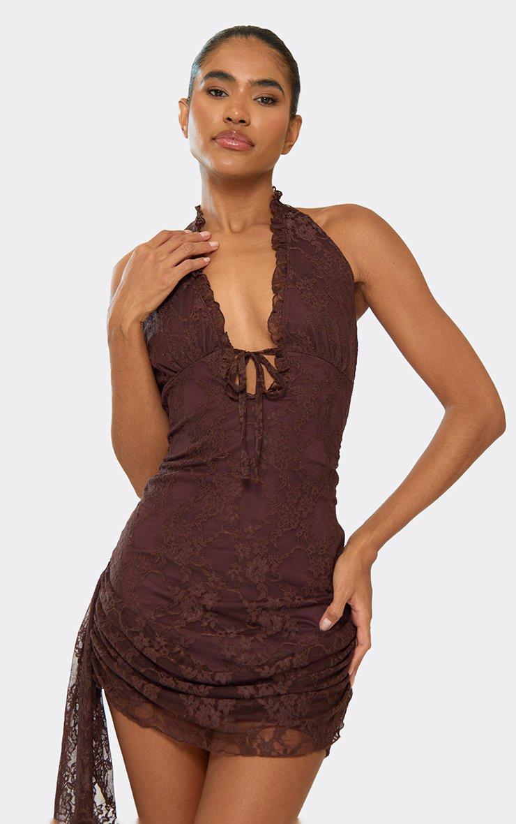 Halterneck Drape Tie Front Detail Mini Dress In Chocolate Brown Lace