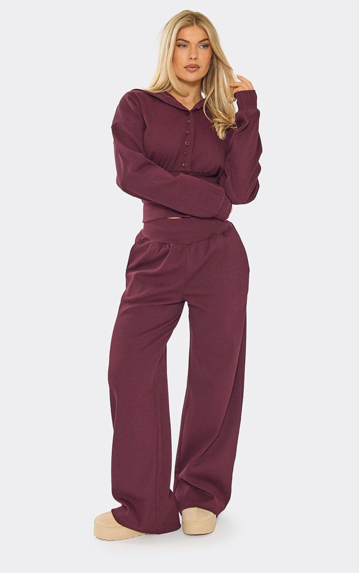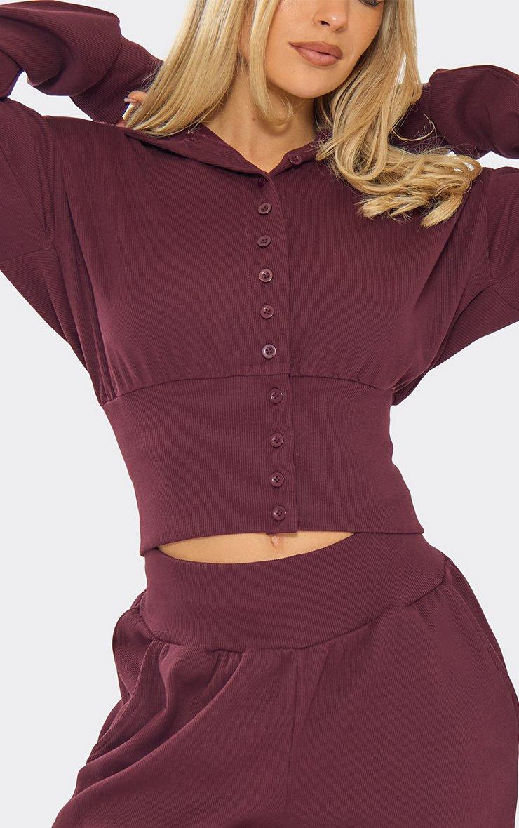 Perfect for off-duty or casual vibes, doll. Featuring plum ribbed material with cinched waist and button-up detailing, this hoodie adds cool, it-girl energy to any outfit. Style with high-waist joggers or jeans and trainers for a boss-babe finish.