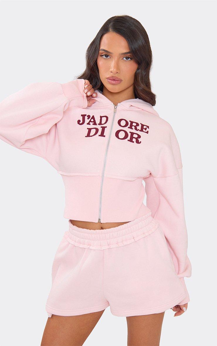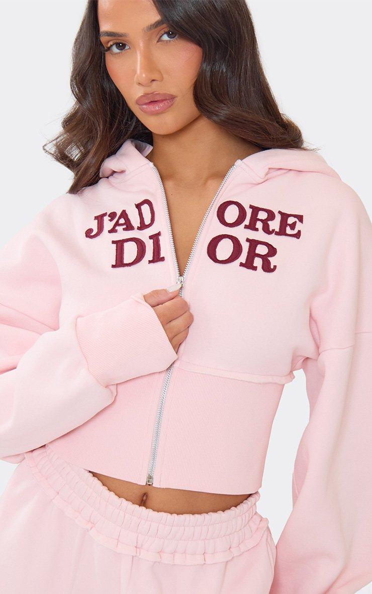 Upgrade your cozy collection in pink material featuring balloon sleeves, a cinched waist, and logo graphic detailing. This sharp, high-octane zip-up hoodie delivers a total "soft girl" aesthetic for a major it-girl finish. Style with matching sweat shorts and silver jewelry for a polished vibe.