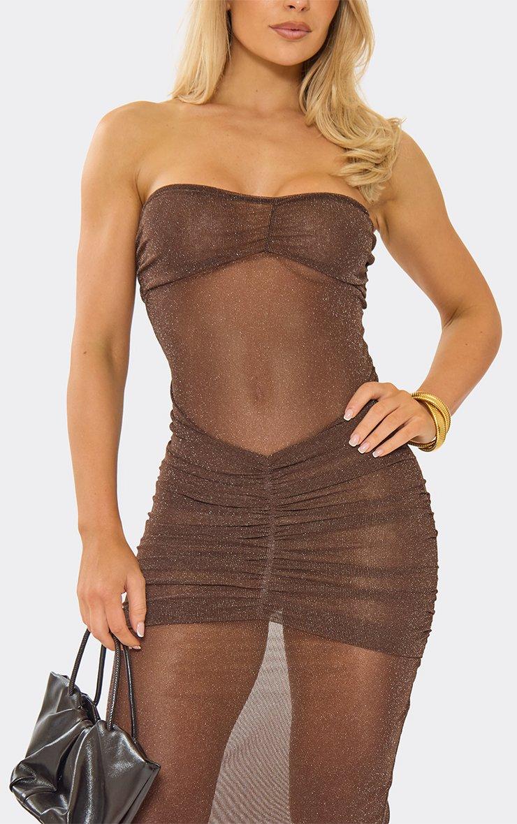 Bandeau Ruched Front Detail Maxi Dress In Brown Metallic Glitter