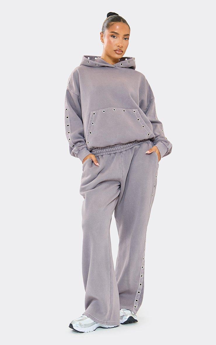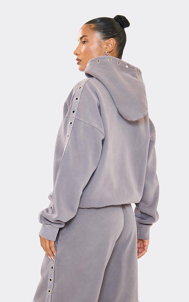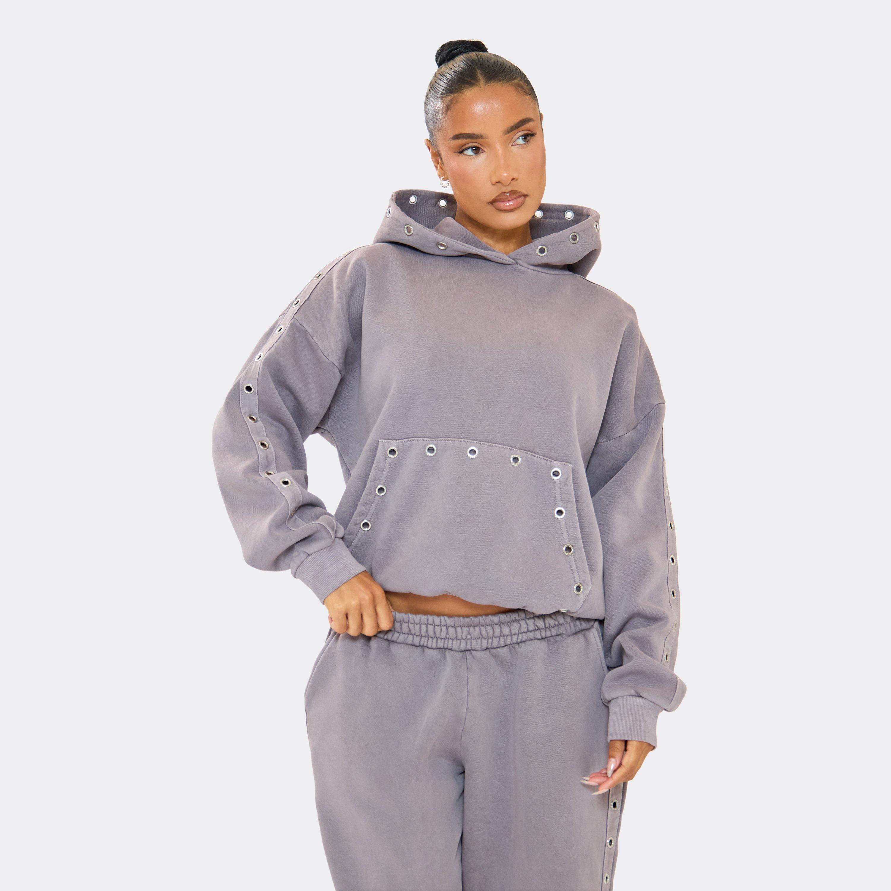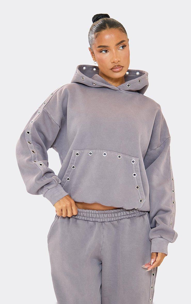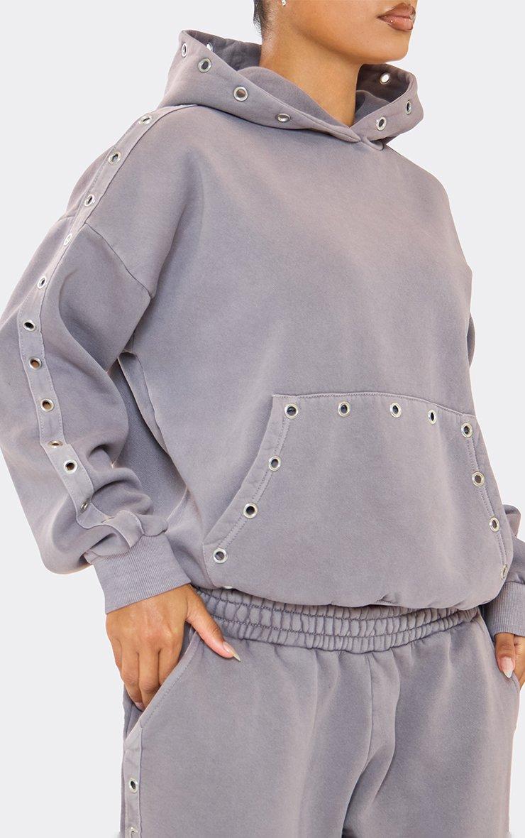 Serve edgy, laid-back vibes, doll. Featuring washed dusk purple material with eyelet and oversized hoodie detailing, this piece brings cool it-girl energy. Style with leggings and trainers for a bold casual look.