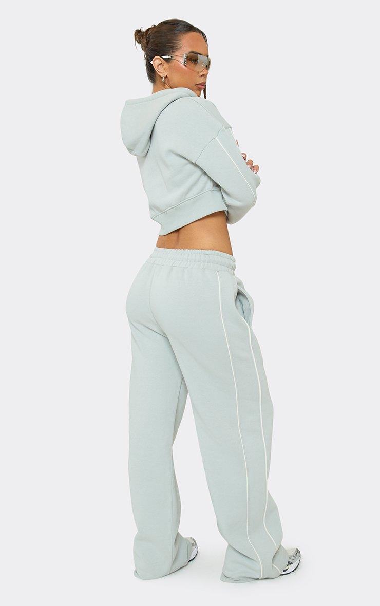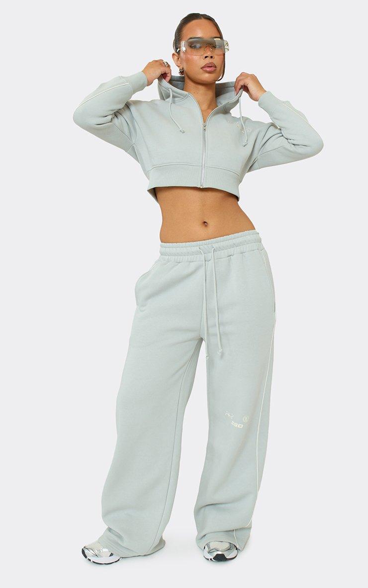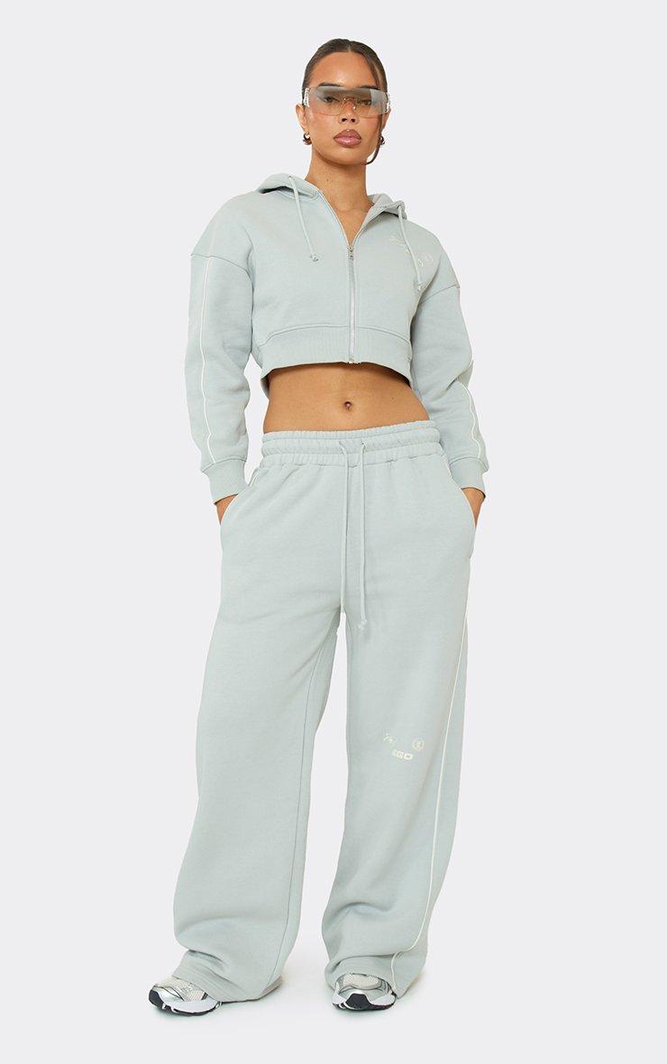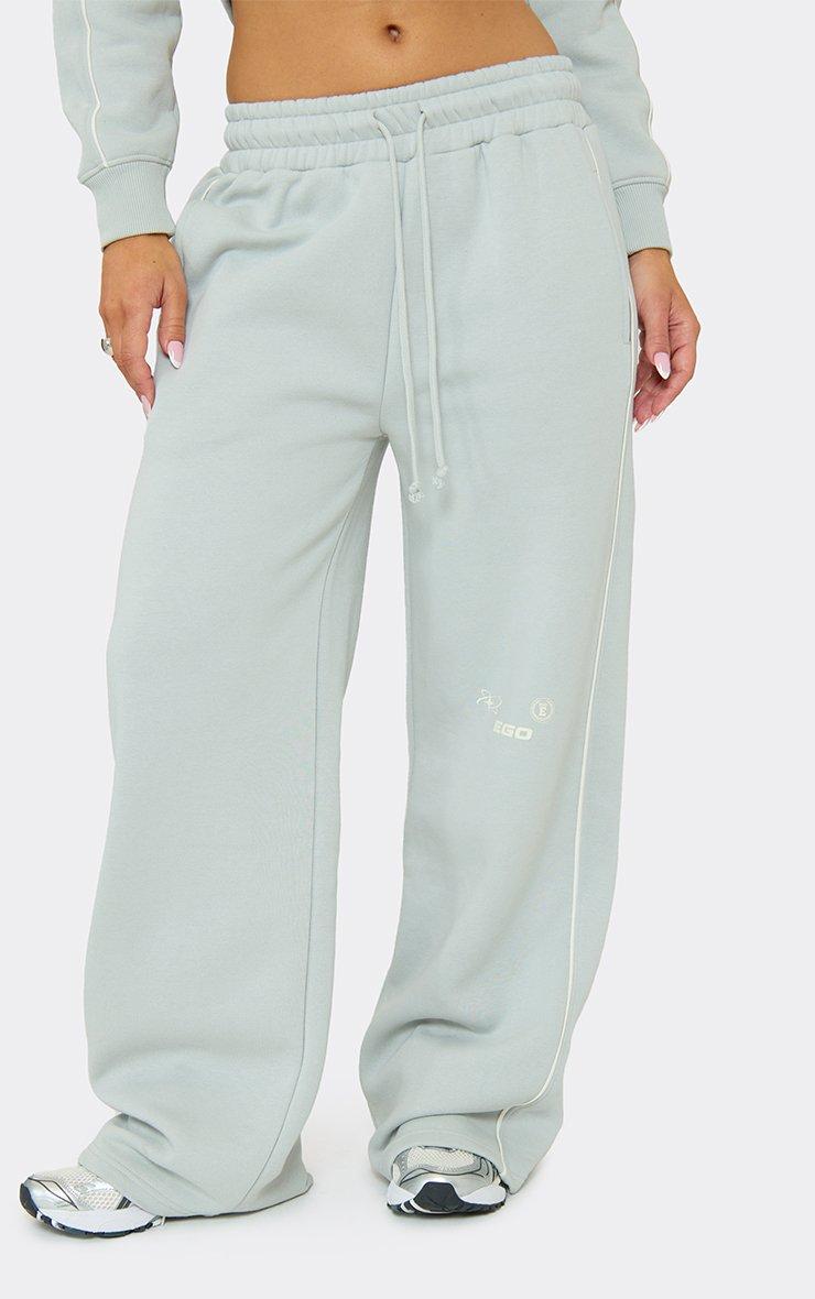 Casual days get street-ready it-girl energy with these standout joggers. Featuring light grey marl soft fleece material with low rise fit, drawstring waist, wide leg and striped Ego graphic detailing. Style with cropped hoodie and trainers for day or fitted top and boots for polished plans.