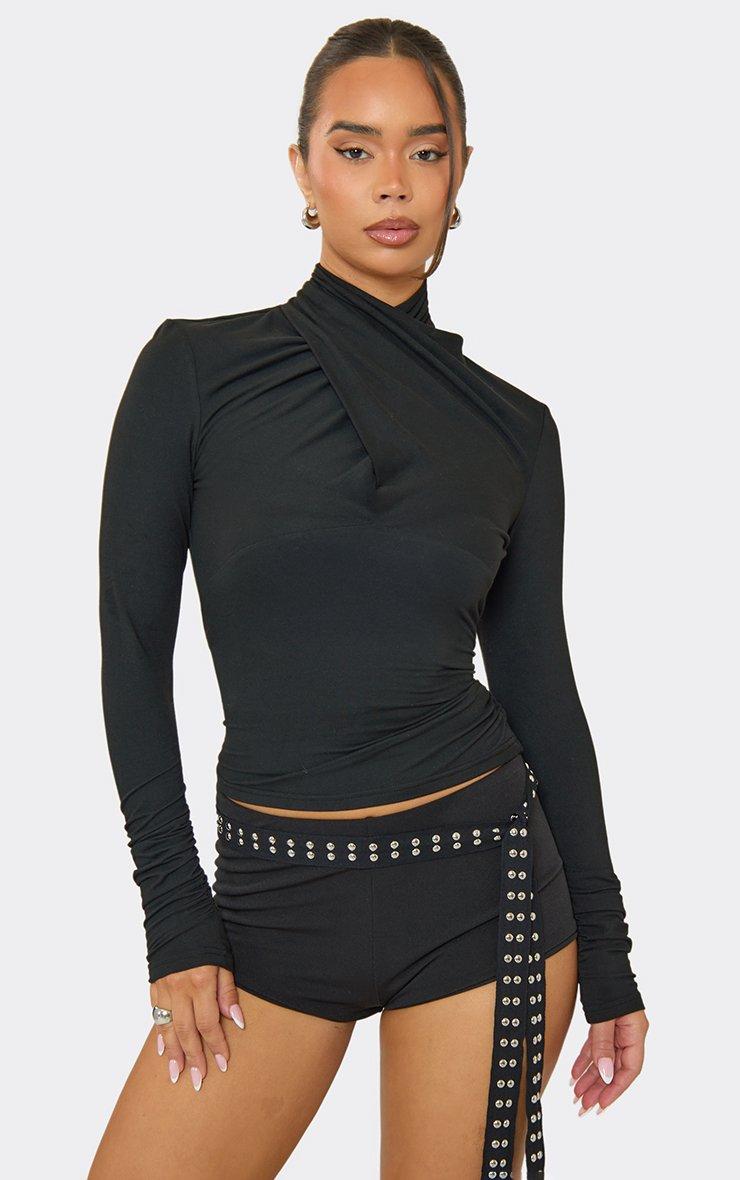 High Neck Wrap Detail Top In Black