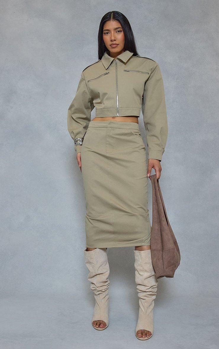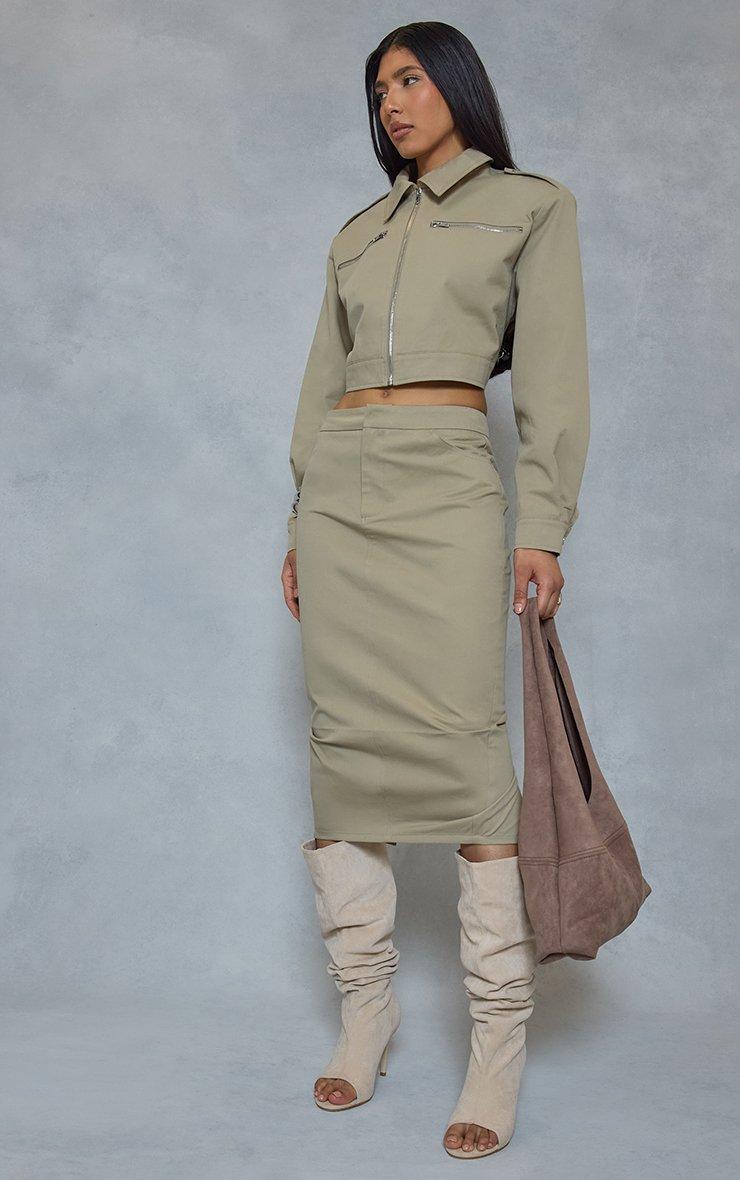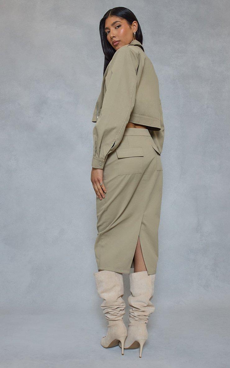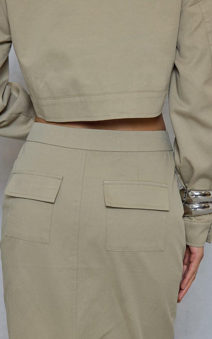 Utility meets effortless style in this khaki utility skirt. Designed with a mid-rise fit, midi length, and functional pocket details, it brings structure and practicality without compromising on edge. If you’re putting together concert outfits, style this skirt with a cropped top, gold hoops, and black knee-high boots for a look that’s comfortable, on-trend, and ready for the vibes. Add this khaki utility skirt to your rotation, a versatile piece for nights out that demand style with ease.