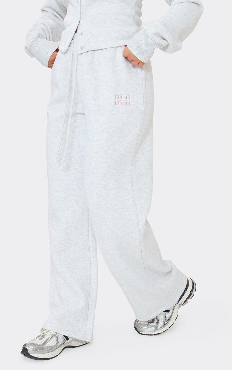 Drawstring Mid Rise Waist Min Min Embroidered Detail Wide Leg Joggers In Light Grey Marl