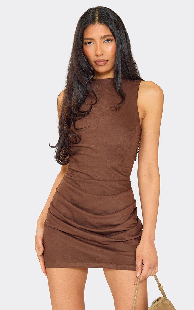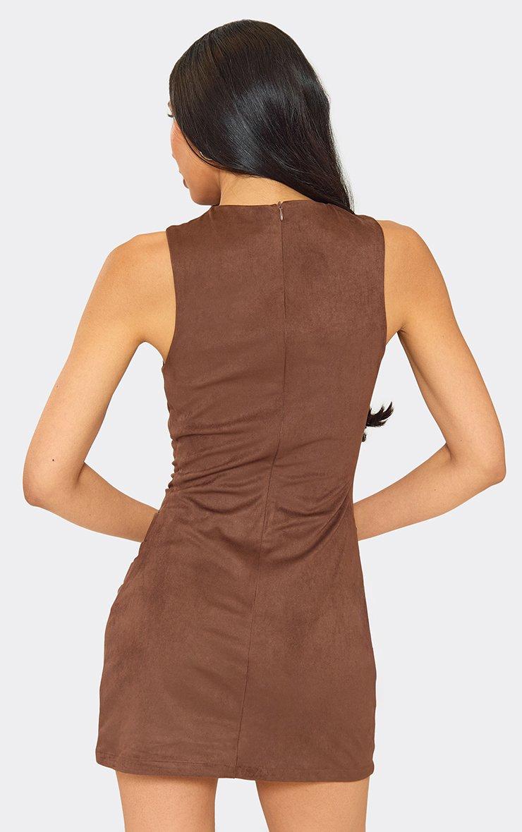 Racer Neck Drape Detail Mini Dress In Brown Faux Suede