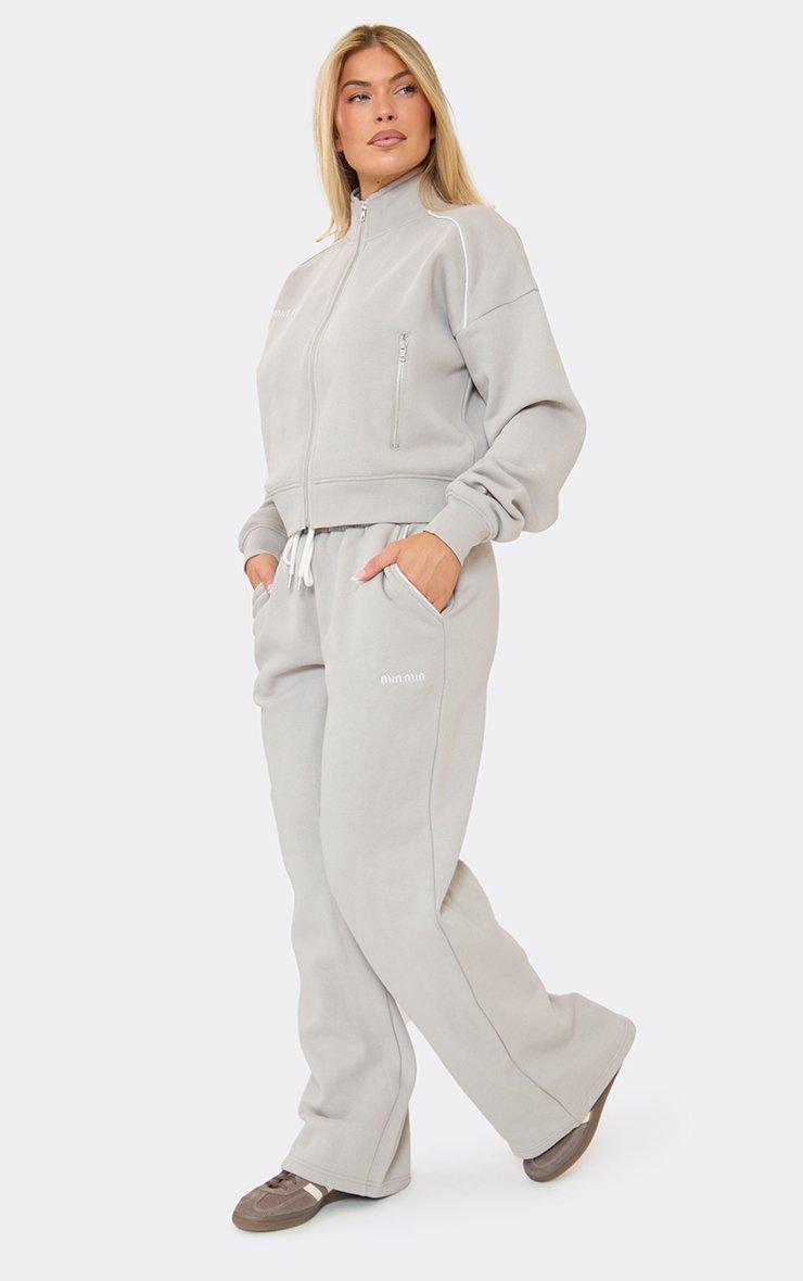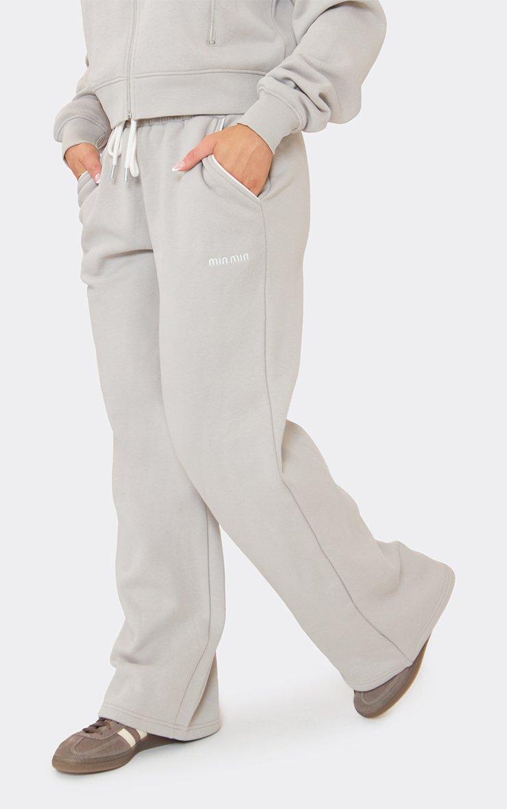 Perfect for casual days or street-style vibes, grey brushed fabric with mid-rise waist, contrast piping, ‘Min Min’ embroidered graphic, and wide-leg detailing for a relaxed, on-trend finish. Pair with the matching sweatshirt or a fitted top and trainers for effortless it-girl energy.