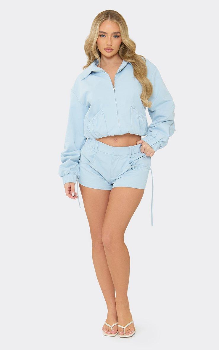 Level up your festival fit with these blue beauties. Featuring a baby blue material with mid rise and ruched pocket detailing, these mini shorts are a total mood. Style with the matching jacket and chunky boots for an edgy it-girl vibe.