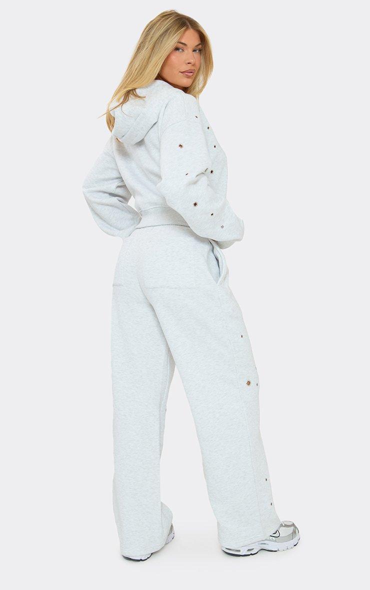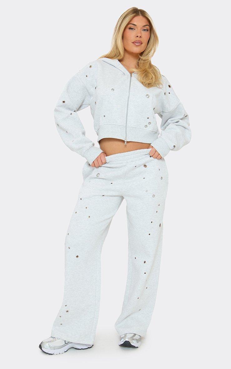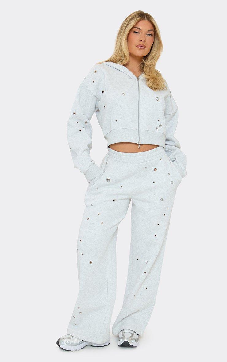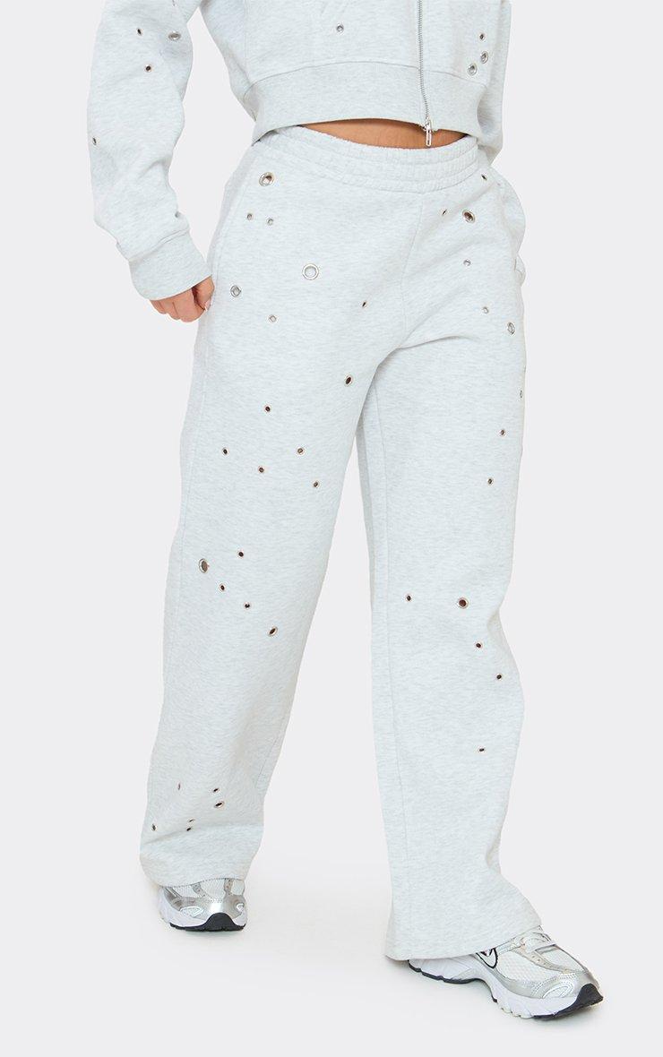 Keep it cozy but chic, doll. Featuring light grey marl material with eyelet detailing and a wide-leg fit, these joggers are a total mood. Style with the matching hoodie and chunky trainers for a high-end, it-girl aesthetic.