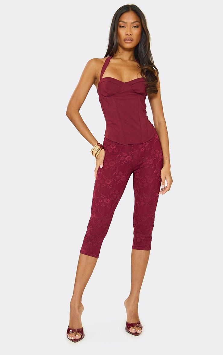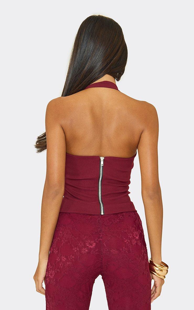 Elevate your evening rotation with this season-essential aesthetic. Featuring burgundy woven material with halter neck corset cup detailing, this piece is serving pure boss-babe energy. Style with some faux leather trousers and gold heels for a total vibe.