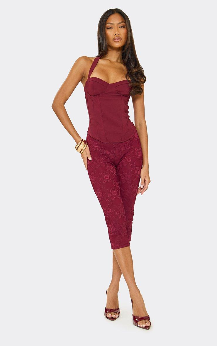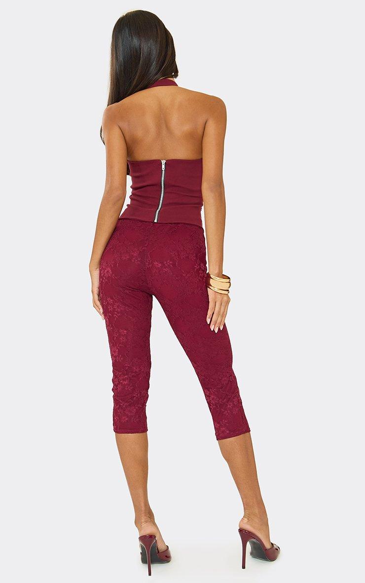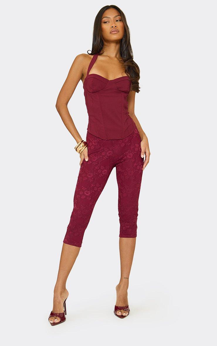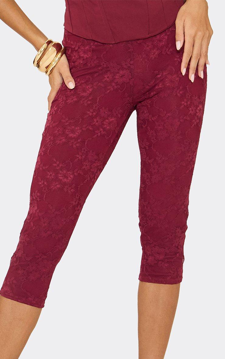 Upgrade your street-style game with these season-essential bottoms. Featuring burgundy lace material with mid-rise capri detailing, these trousers are a total 00s-inspired mood. Style with a cropped baby tee and pointed slingbacks for an iconic vibe.