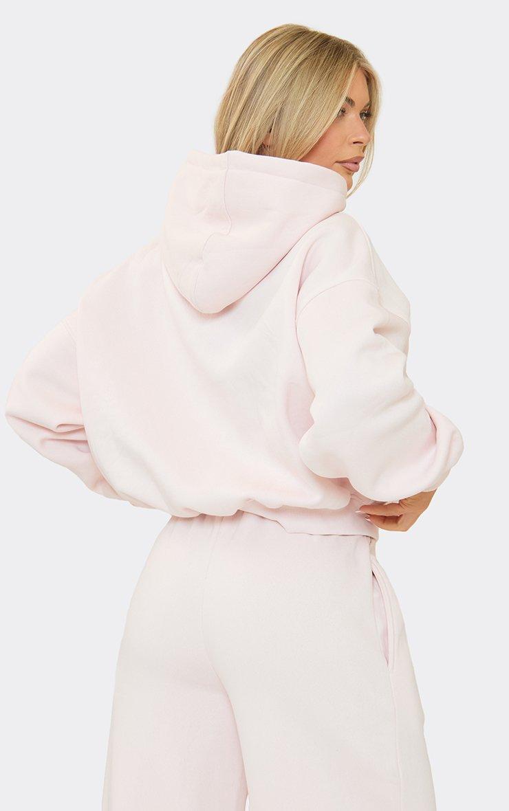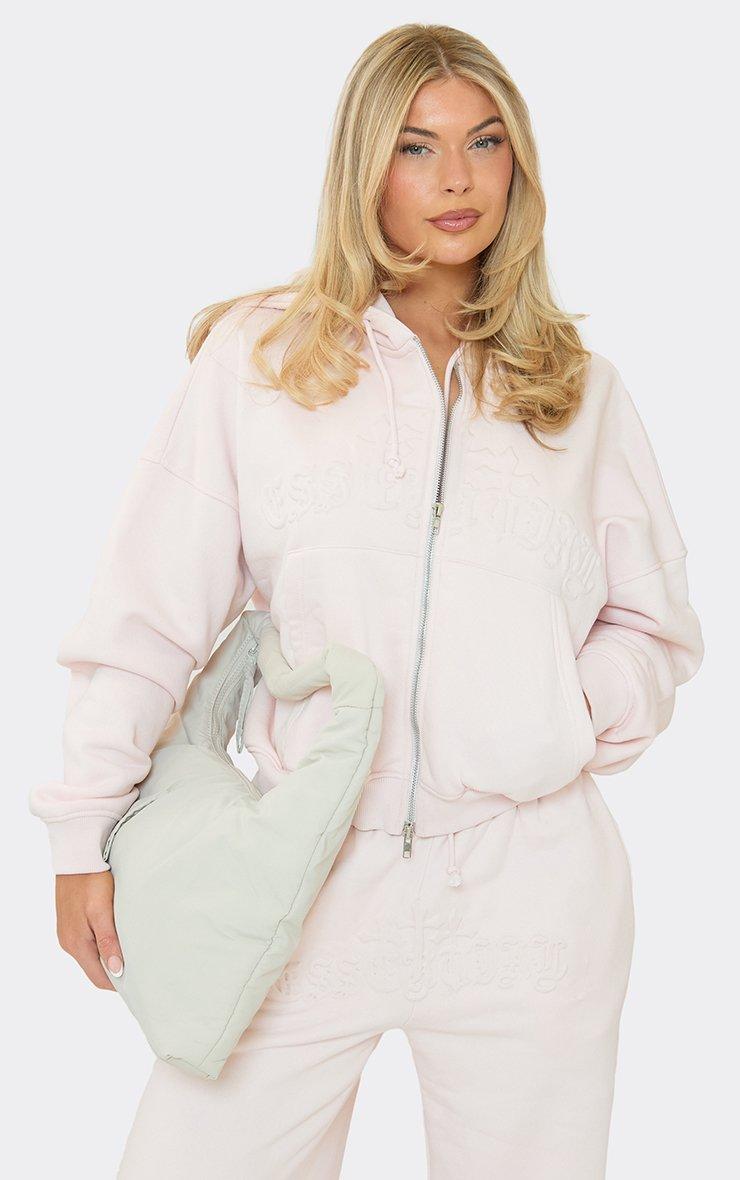 Upgrade your loungewear rotation in pink material featuring embossed graphic detailing and an oversized zip-up front. This sharp, high-octane hoodie delivers a total "soft girl" aesthetic for a major it-girl finish. Style with matching wide-leg joggers and silver jewelry for a polished vibe.