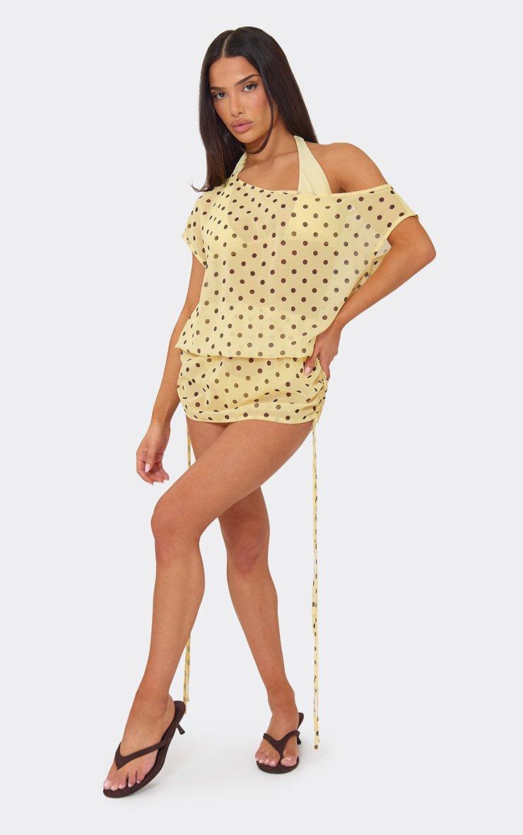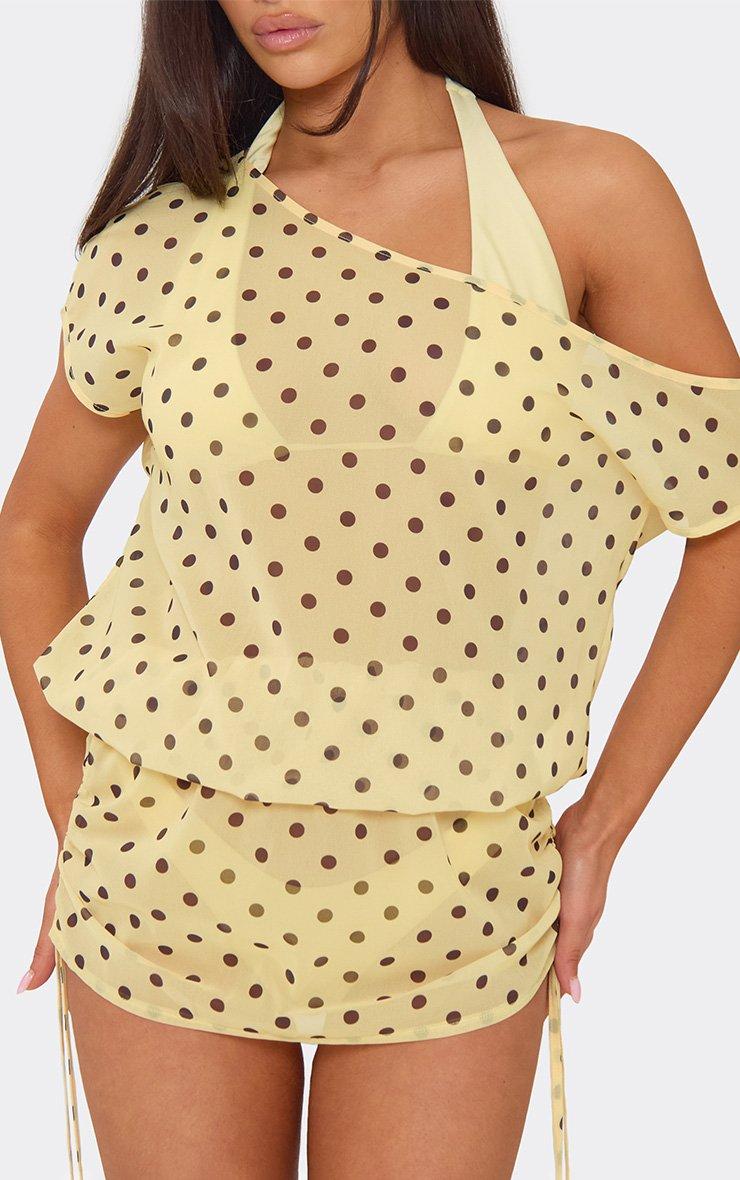 Off The Shoulder Blouson Mini Beach Dress In Lemon Polka Dot