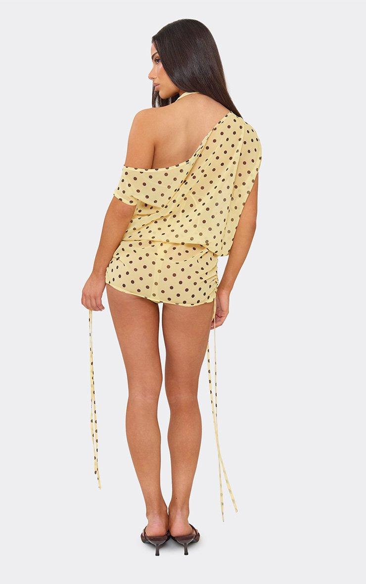 Step into your main character era in lemon polka dot material featuring an off the shoulder neckline and blouson fit. This sharp, high-octane mini beach dress delivers a total "retro-beach" aesthetic for a major it-girl finish. Style with the matching triangle bikini and gold jewelry for a polished vibe.