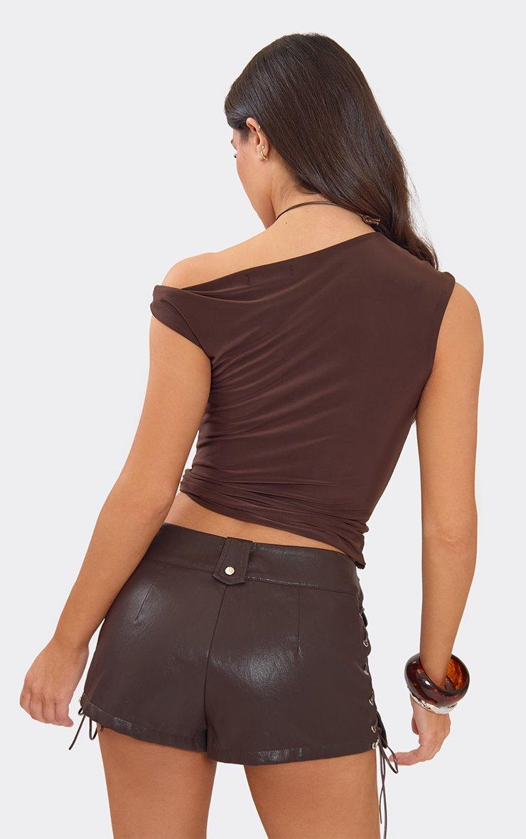 Serving major main character energy, these shorts are a total wardrobe win. Featuring brown faux leather material with stud detailing, they’re the ultimate edgy vibe. Style with a distressed graphic tee and knee-high boots for a look that's pure fire.