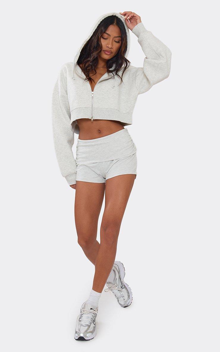 Level up your off-duty staples in light grey marl material featuring a fold-over waistband. These sharp, high-octane hotpants deliver a total "clean girl" aesthetic for a major it-girl finish. Style with a matching cropped zip-up and silver jewelry for a polished vibe.
