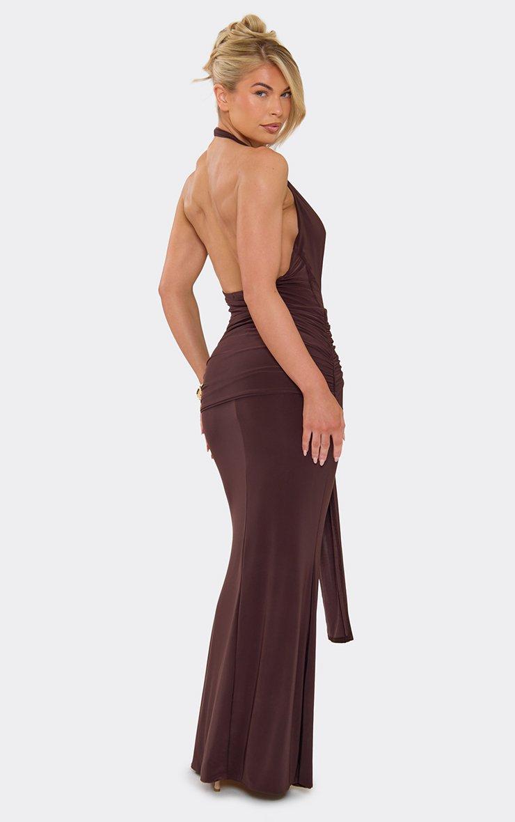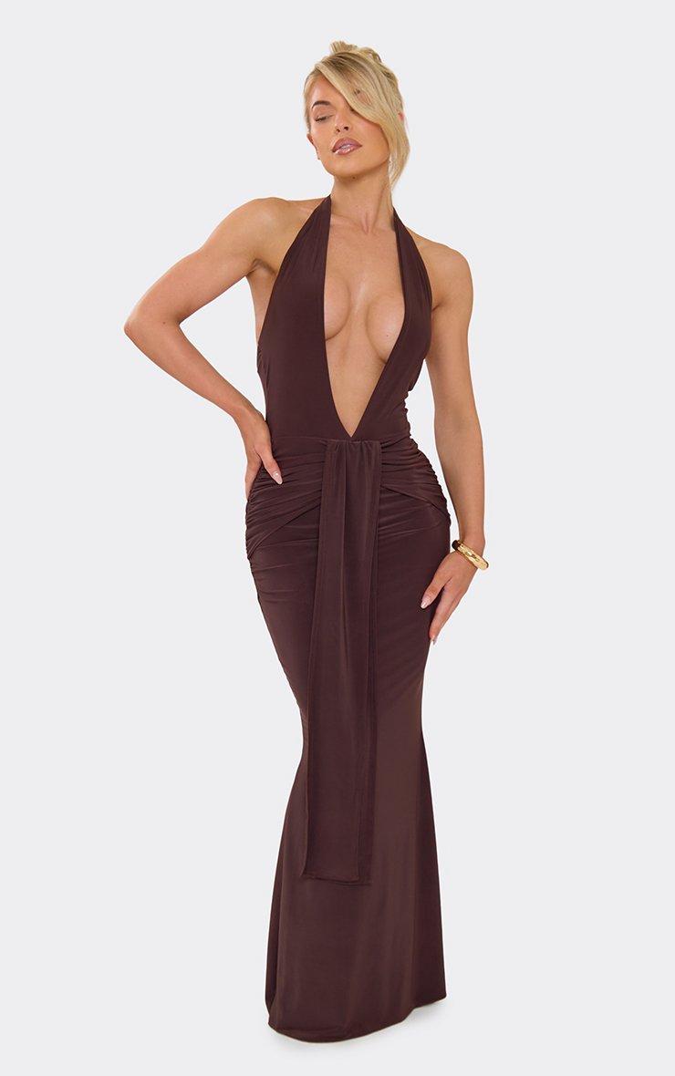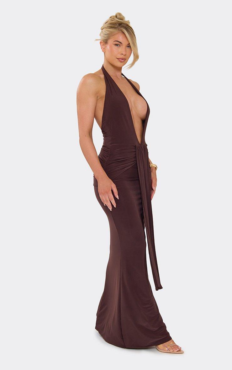 Add a touch of drama to your evening repertoire with this plunge halterneck maxi dress, doll. Featuring a rich chocolate brown fabric with a sophisticated drape front and flattering ruched detailing, it brings a sleek, statuesque edge to your look. Style with gold architectural heels and glowy makeup for a clean-chic aesthetic.