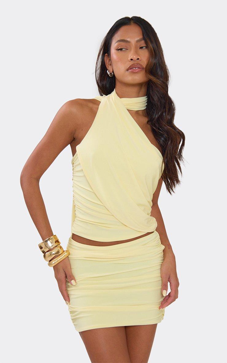 Refresh your summer style in lemon material featuring a one shoulder wrap neck and draped ruched detailing. This sharp, high-octane top delivers a total "clean girl" aesthetic for a major it-girl finish. Style with white linen trousers and gold jewelry for a polished vibe.