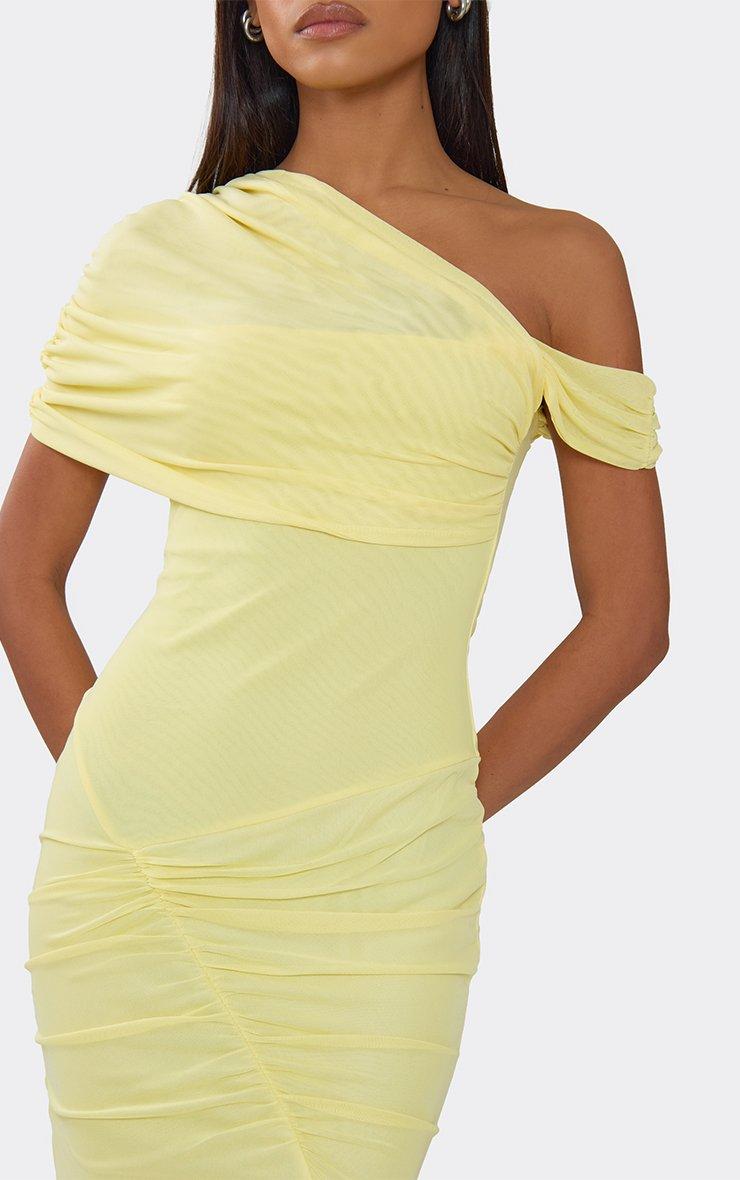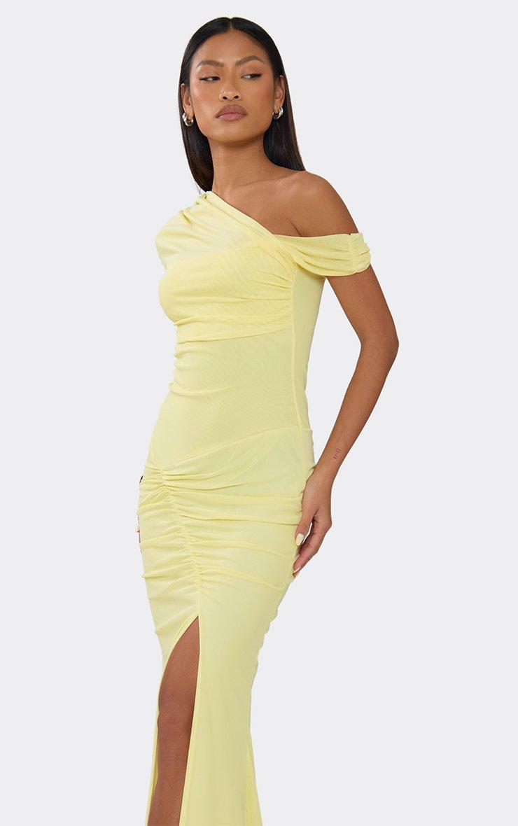 Off The Shoulder Layered Detail Ruched Side Split Maxi Dress In Yellow Mesh