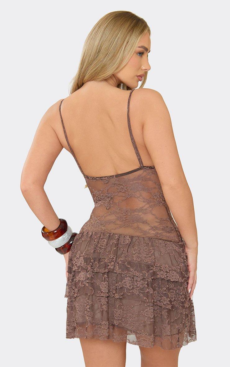Strappy V Neck Tiered Frill Mini Dress In Chocolate Brown Lace