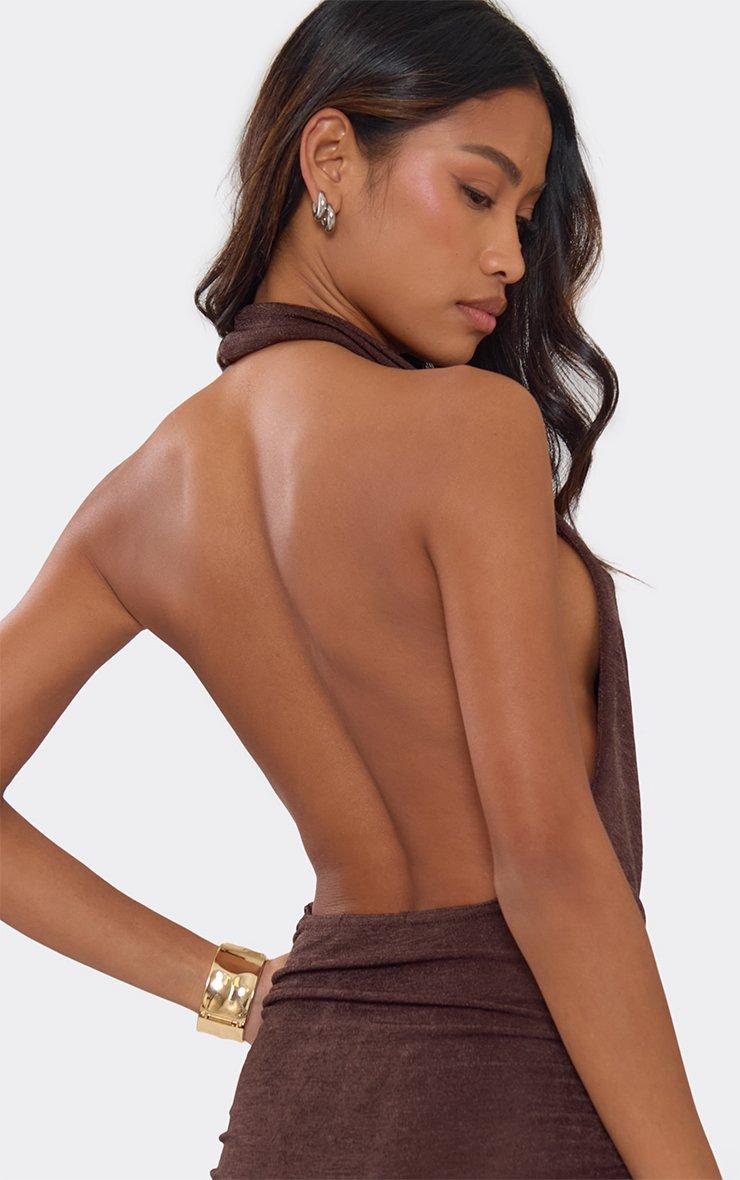 Make a statement at your next summer event in brown material featuring a plunge halterneck and draped front detailing. This sharp, high-octane mini delivers a total boss-babe silhouette for a major it-girl finish. Style with gold tie-up heels and a sleek bun for a polished vibe.