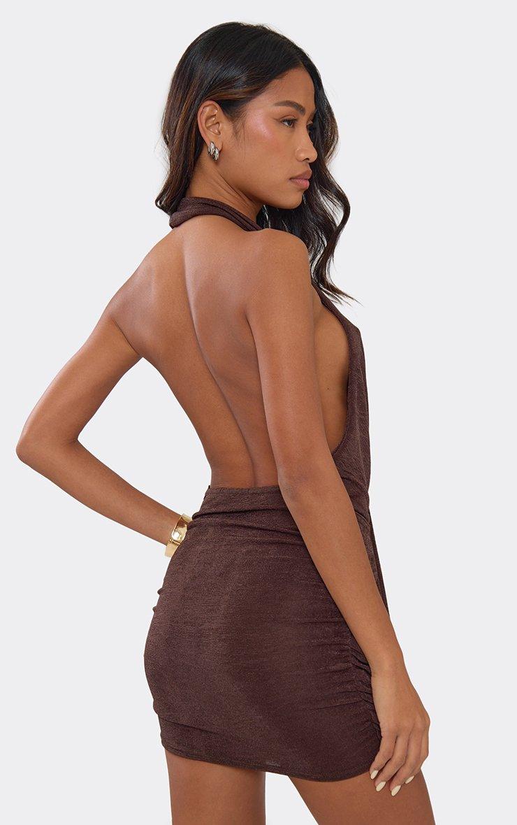 Plunge Halterneck Draped Front Mini Dress In Brown