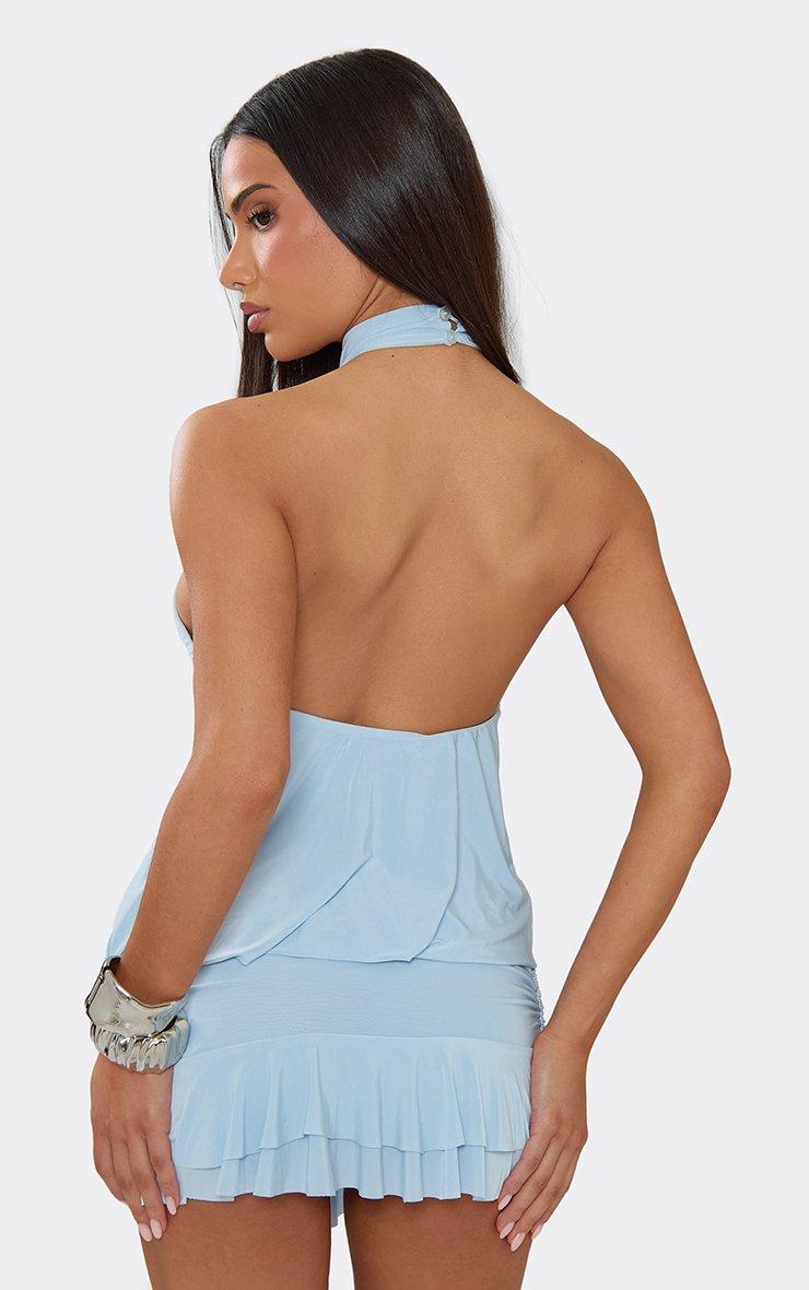 Steal the spotlight at your next occasion in blue material featuring a high neck, blouson fit, and frilled hem detailing. This sharp, high-octane mini delivers a total boss-babe silhouette for a major it-girl finish. Style with silver heels and a sleek bun for a polished vibe.