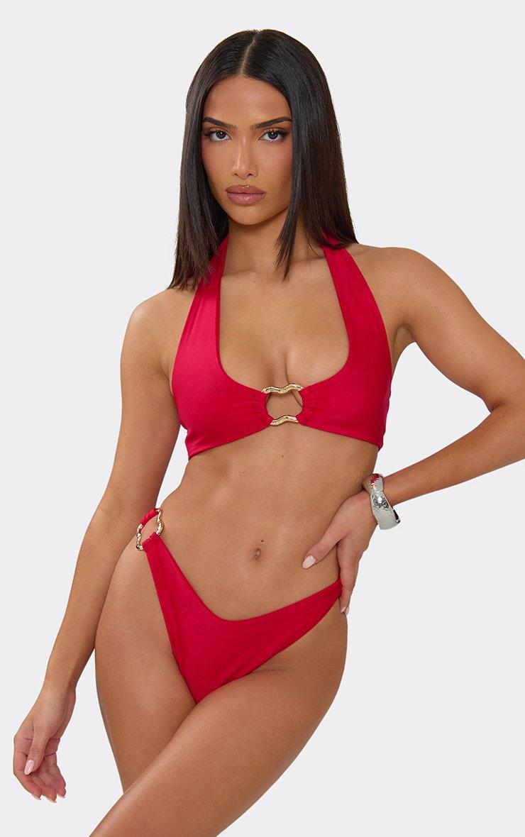 Get ready to turn heads at your next pool party. Featuring red material with halterneck trim detailing and a knot front skirt. Team with gold wedges and a matching beach bag for a look we are totally obsessed with.