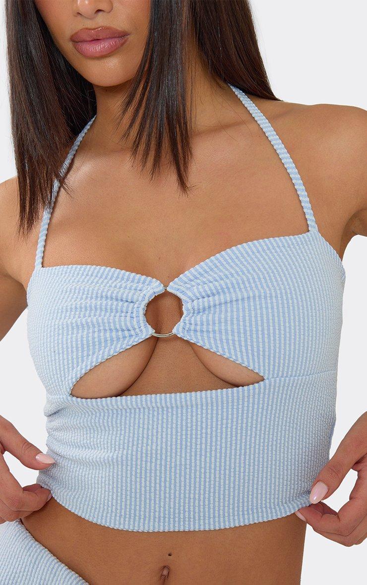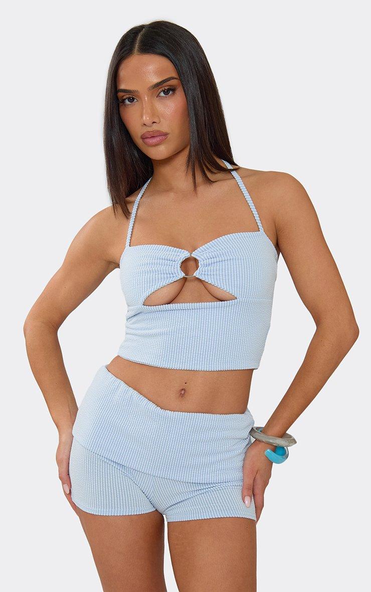 Step into your main character era in blue stripe material featuring a halterneck and cut-out ring detailing. This sharp, high-octane crop top delivers a total "coastal-chic" aesthetic for a major it-girl finish. Style with the matching fold-over waistband shorts and silver jewelry for a polished vibe.