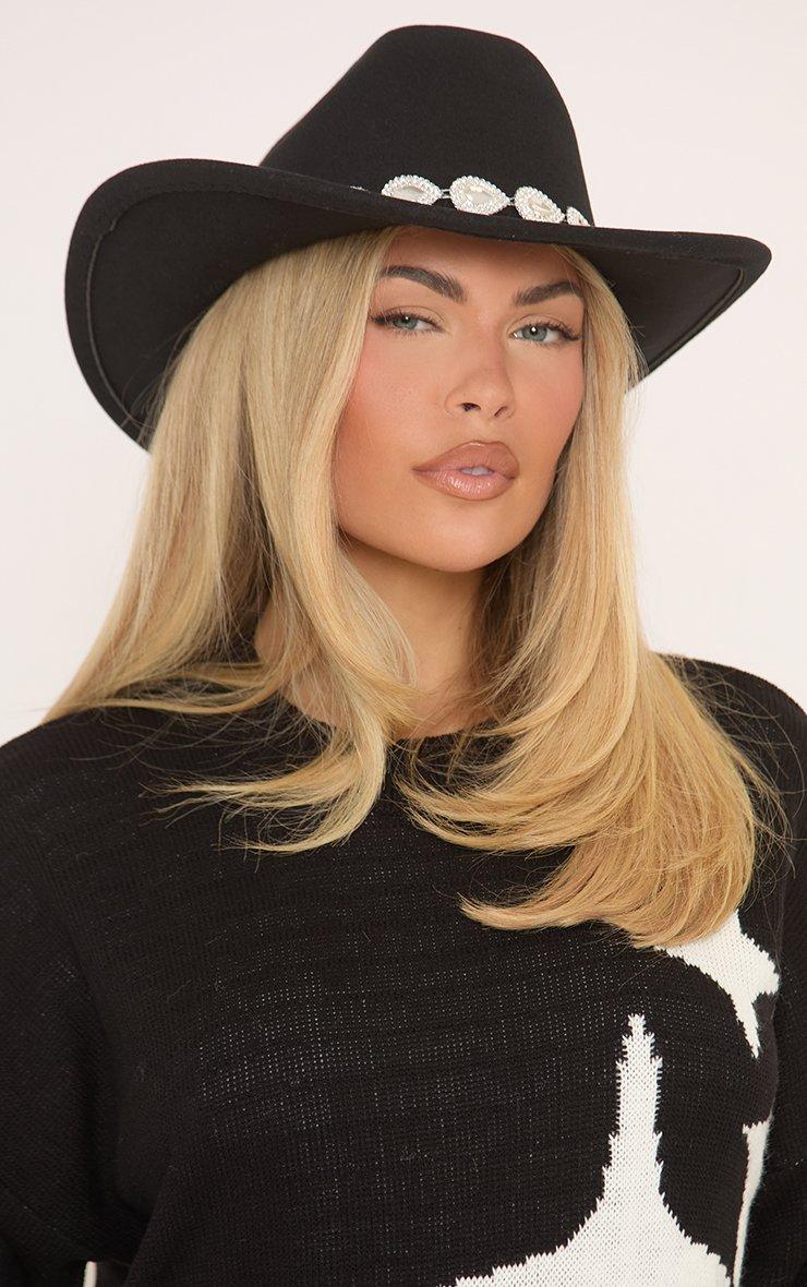 Add some sparkle to your western-inspired look with this black cowboy hat, featuring dazzling diamante detailing. A bold statement piece that brings a touch of glam to any outfit.