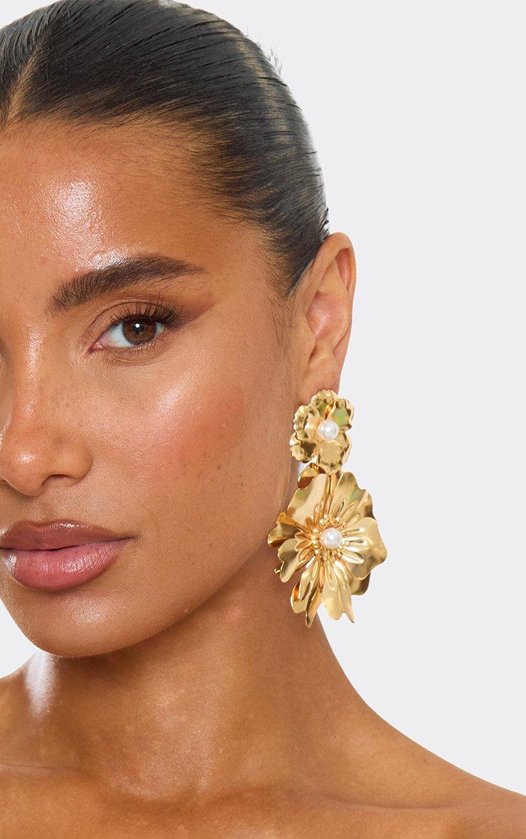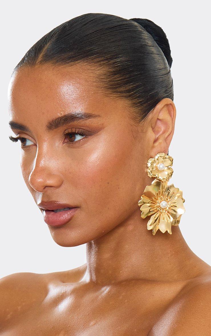 Oversized Double Flower Detail Drop Stud Earring In Gold